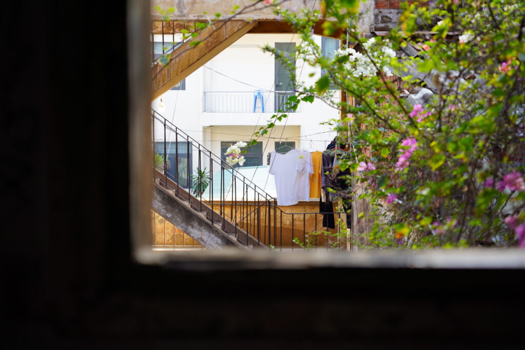 階段を登る途中、ふと足を止めて窓の外を見てみるのも一興。装飾のない無骨なコンクリートの窓枠が果たすのは、外の世界を切り取る額縁の役割。