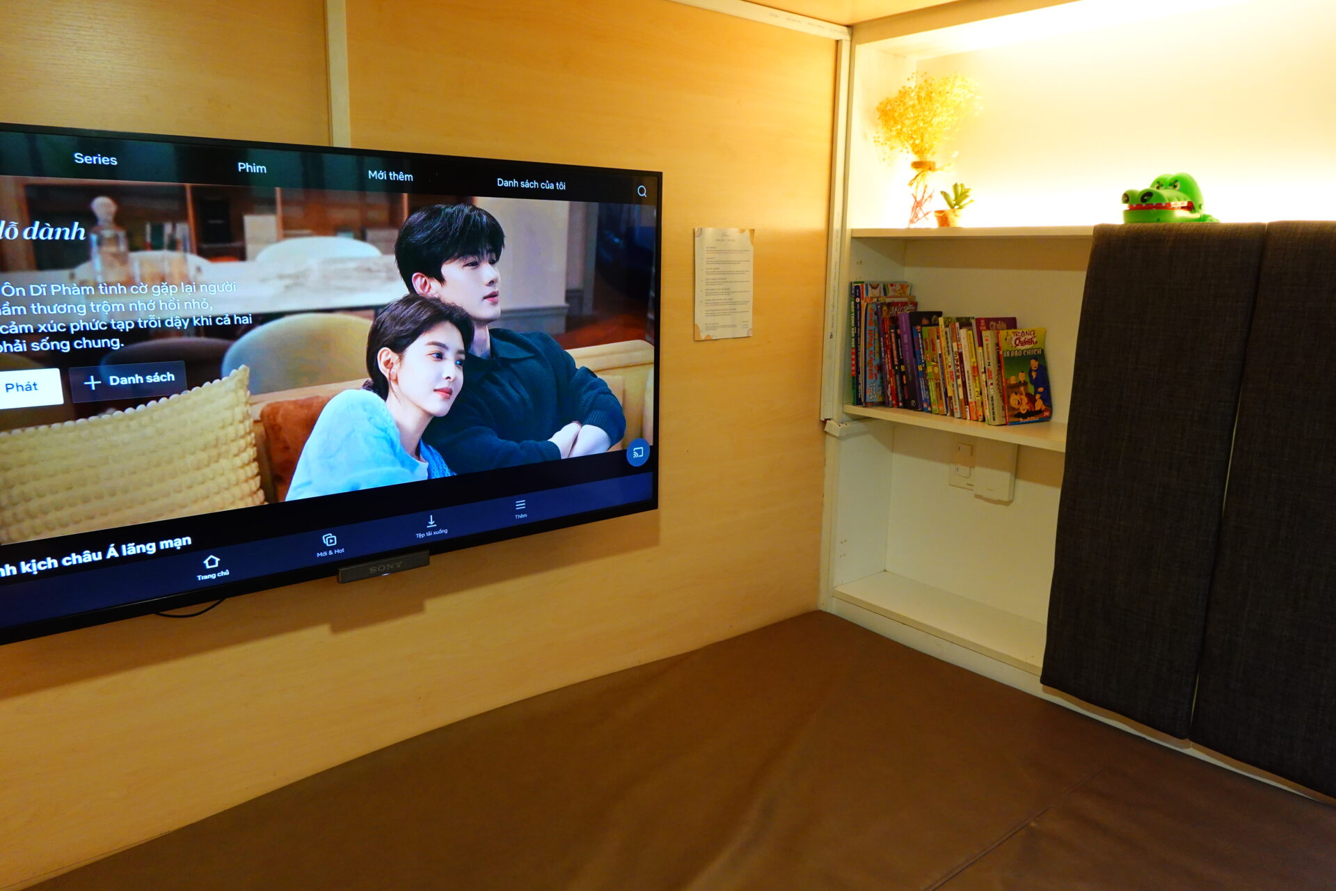 ブースにはテレビが設置され、NetflixやYouTubeを楽しめることを押し出しています…が、ヘッドホンの設置はなし。音漏れの懸念があります。