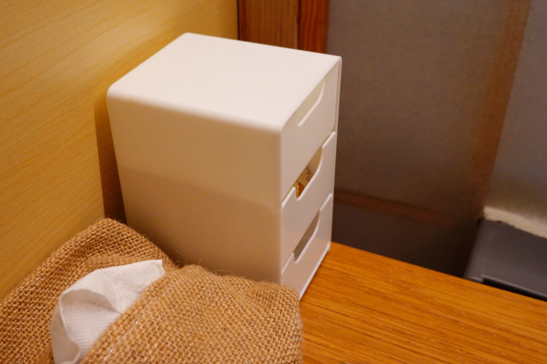 また、施錠可能なカーテンが取り付けられ、ブースの外から中が見えないように。そして、上記の小物入れの中には…お察しください。