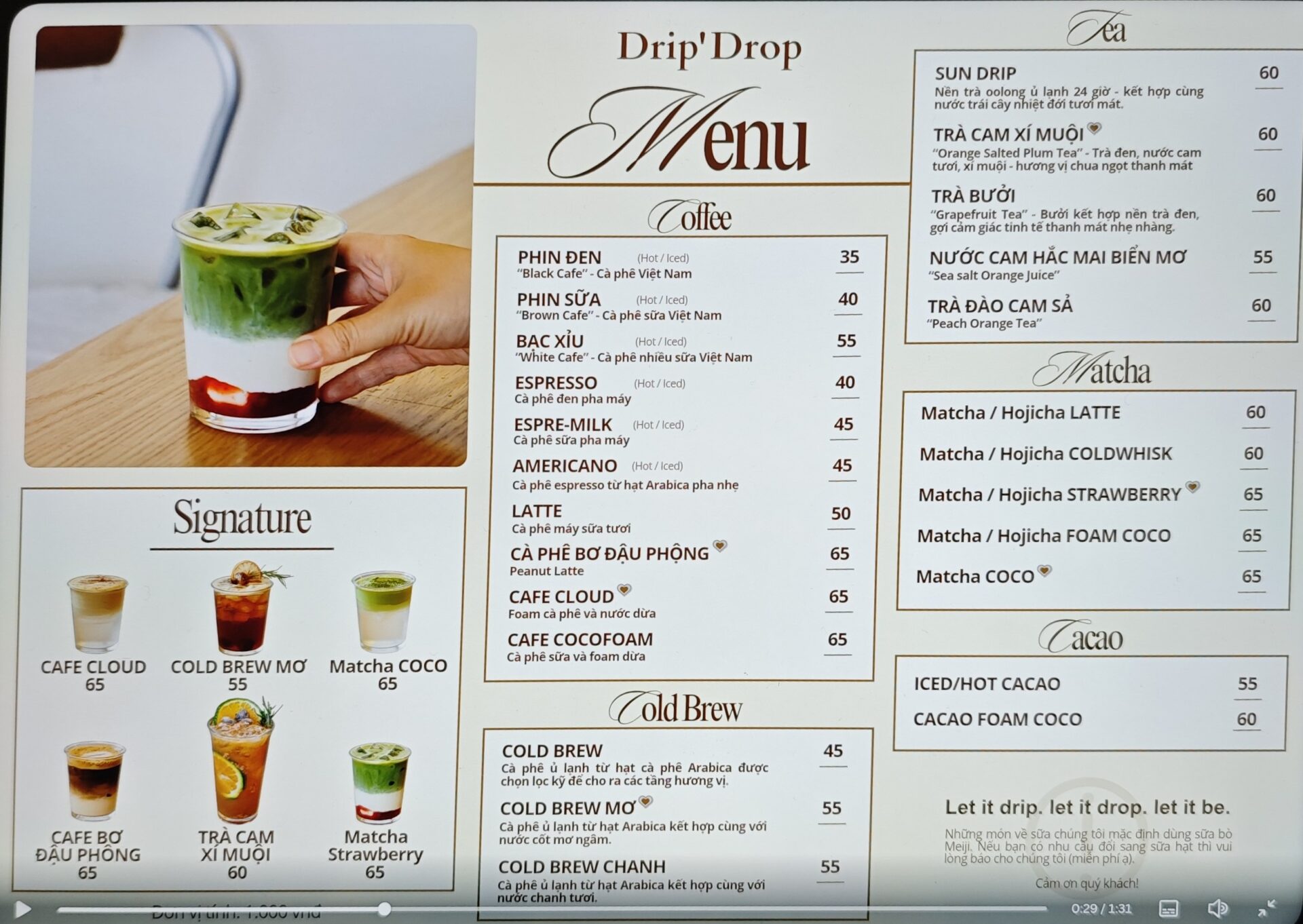 Drip’Drop Kafe」のメニューはこちら。タブレットで確認するのですが、なぜか画像ではなく動画…。