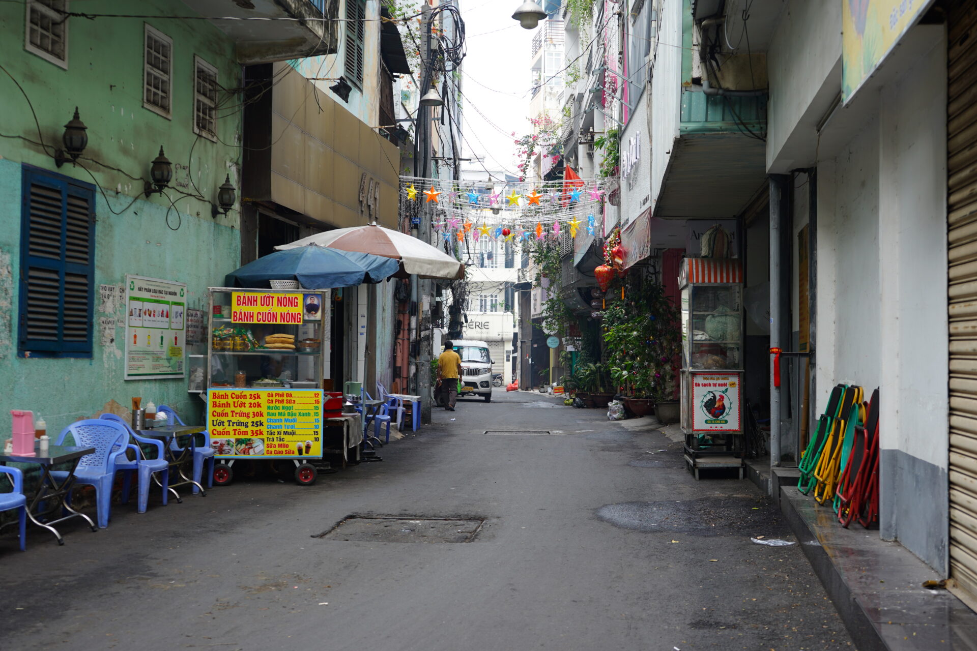 ひとたび大通りからヘム(路地)へと足を踏み入れると、バインウットのローカル屋台から湯気が立ち上り、近隣住民の生活音が聞こえてくるような路地裏風景。