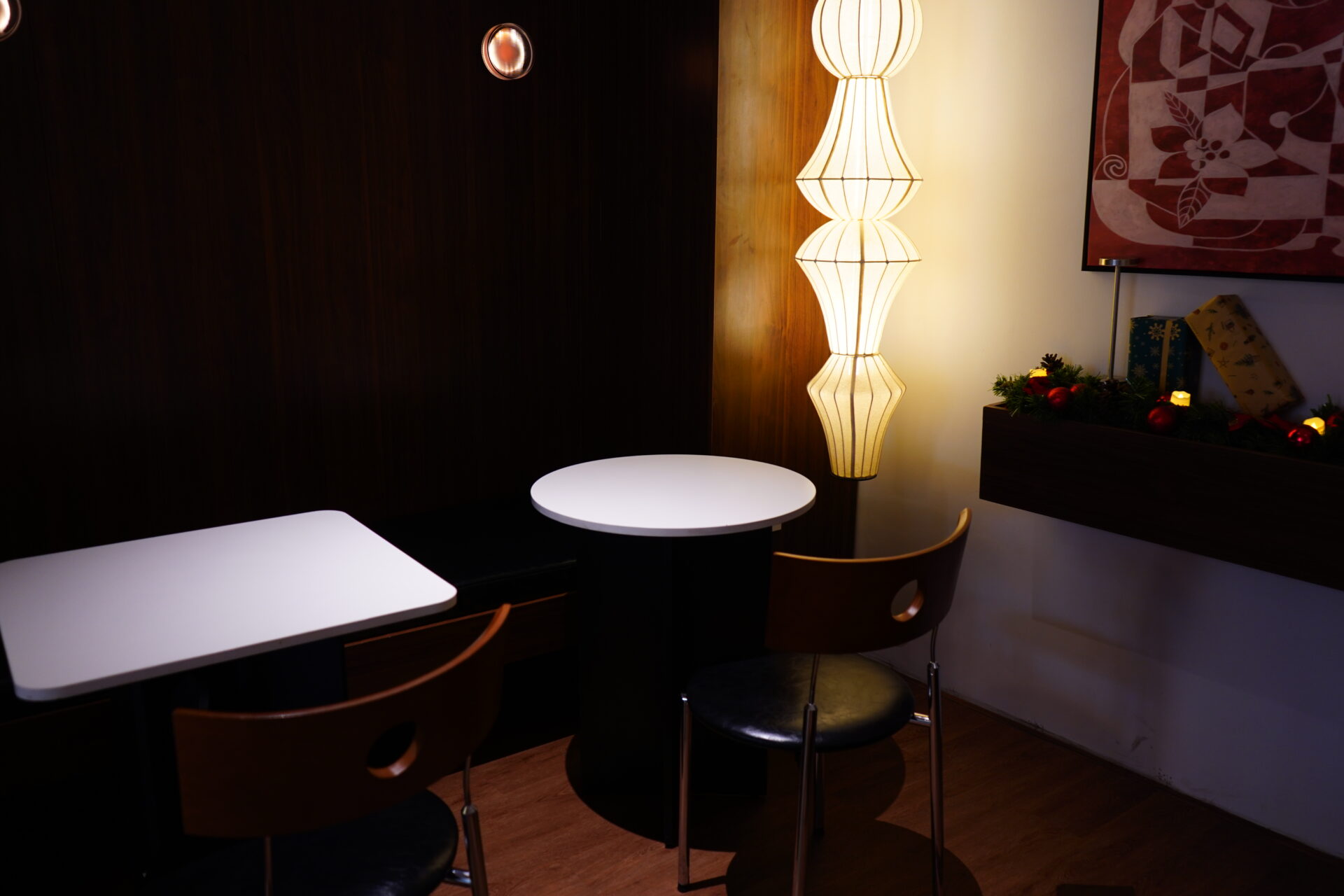 反対側には、2〜3人掛けのテーブルやソファ席に加え、6人掛けほどの大きな白いテーブルと、壁一面の格子状のシェルフ。書斎やライブラリーのような知的な雰囲気。