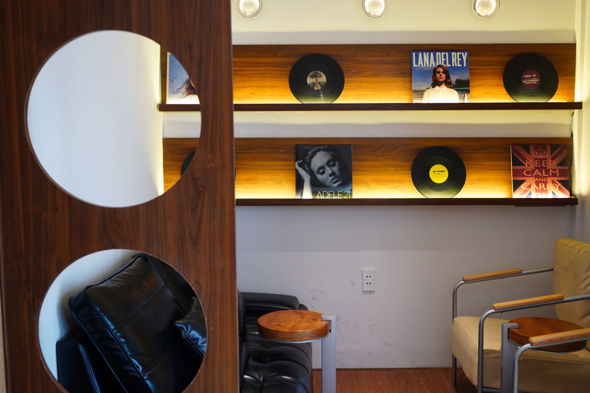 フロアの片側には、黒いレザー調のソファとアームチェアが配置されたラウンジエリア。ここにも壁面にレコードが飾られ、間接照明で照らされたジャケットアートがギャラリーのような雰囲気を演出。