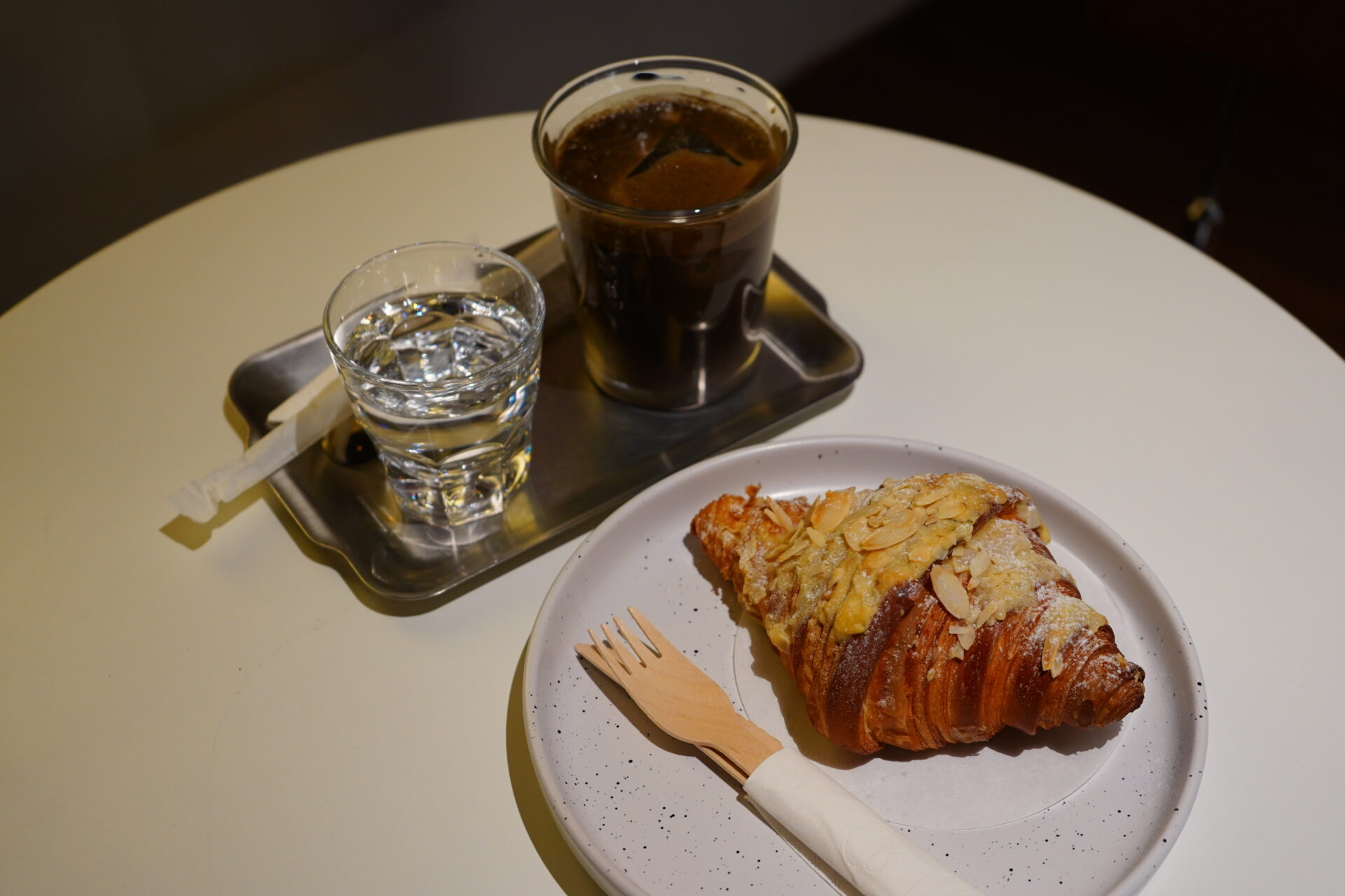 Houjicha Latte(ほうじ茶ラテ)」60,000ドンと、お供に「Croissant Hạnh Nhân(アーモンドクロワッサン)」45,000ドンを注文。