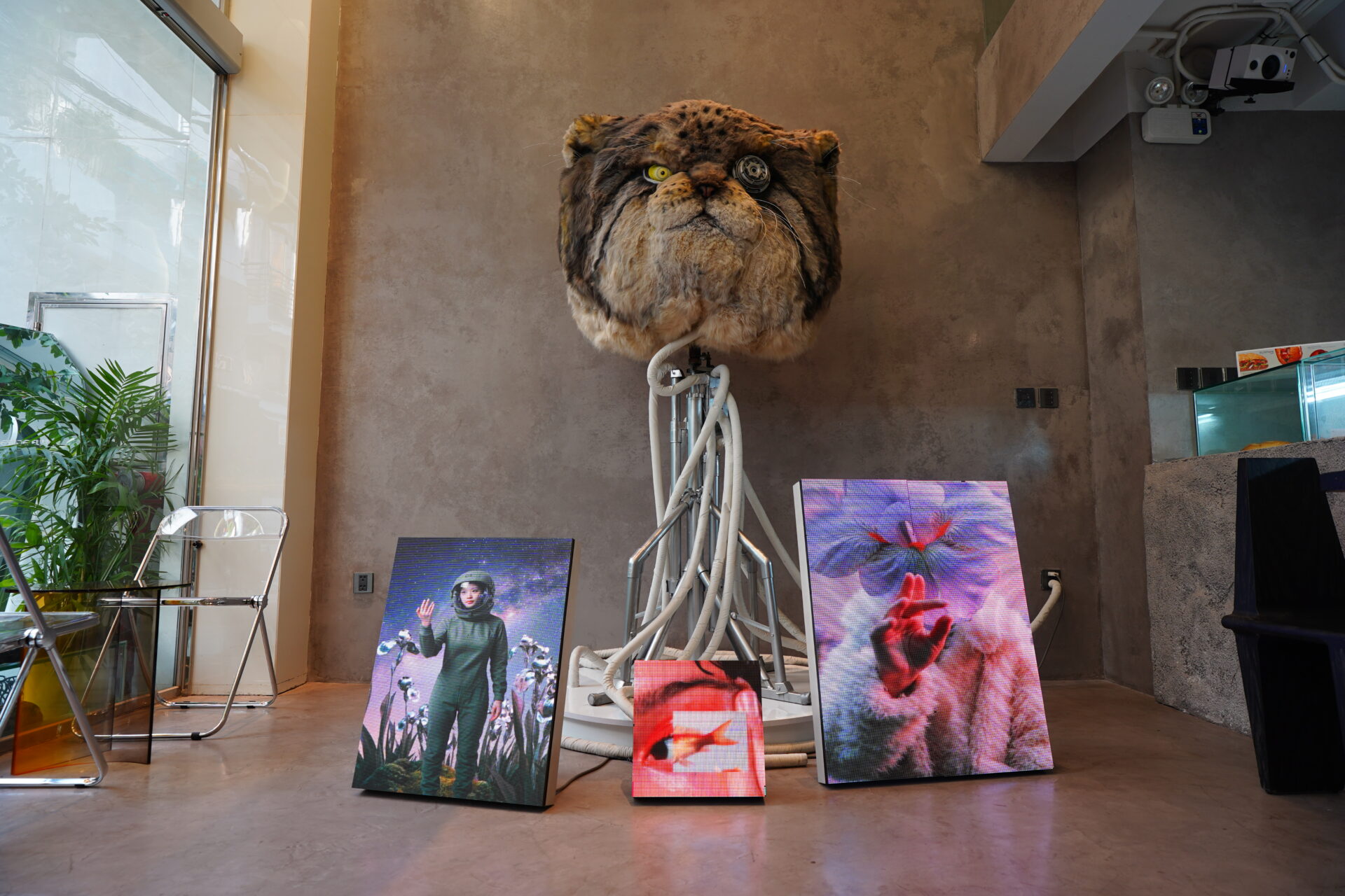カウンター横に鎮座する巨大な猫の頭のオブジェ。電源に繋がっており、ゆっくりと首を振り続けているのである。デジタルスクリーンと相まって、一気にシュール(って安易に使いたくないけど)でアーティスティックな世界観に引き込まれます。