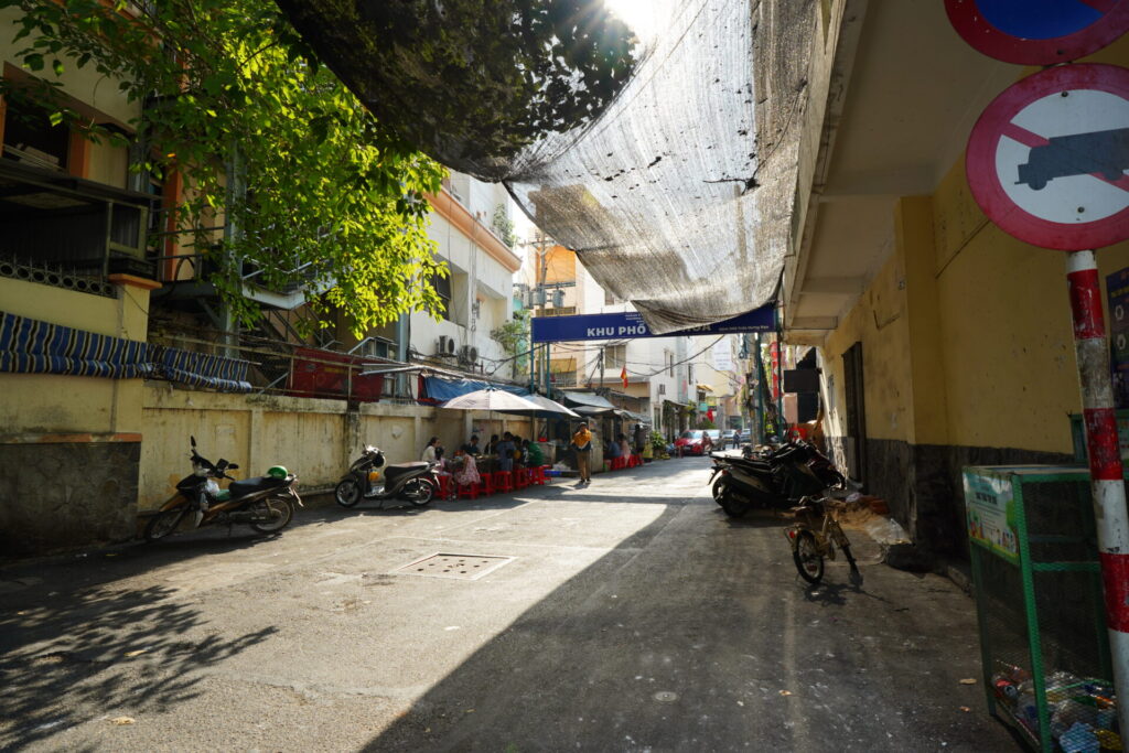 お店があるのはホーチミン市の主要道路の一つ、チャンフンダオ (Trần Hưng Đạo) 通りの路地裏。聳え立つ街路樹に絶え間なく行き交うバイク―まさにホーチミンといった風景。