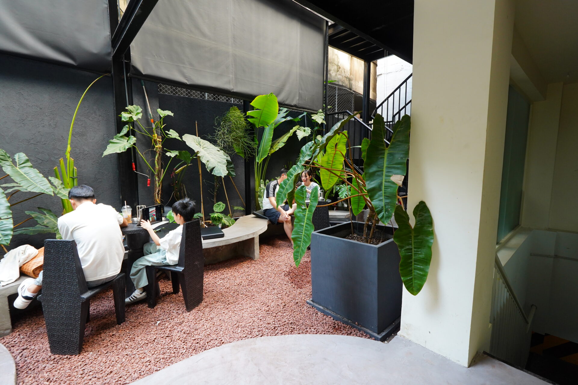 一方で、店内の奥には大きな観葉植物が配置されたテラス席が。無機質なデザインの中に自然の温かみが共存しています。