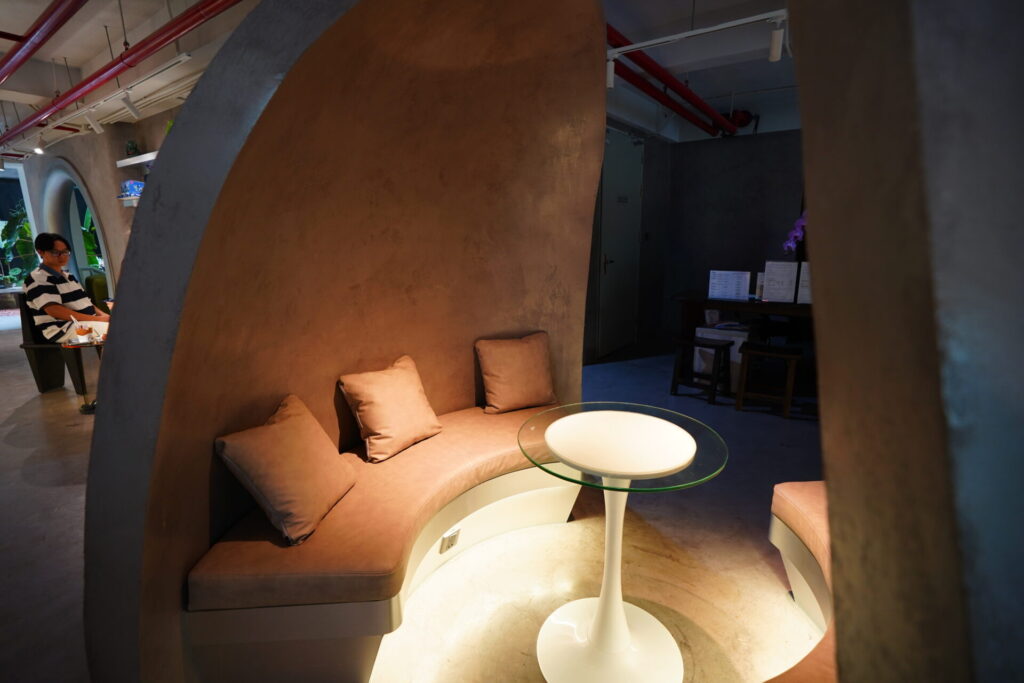 客席のデザインも秀逸。コンクリート風の半球体で作られたコクーン(繭)型のシートは、包み込まれるような安心感。友人との深い会話や、一人で作業に没頭したい時にはサイコーの特等席。