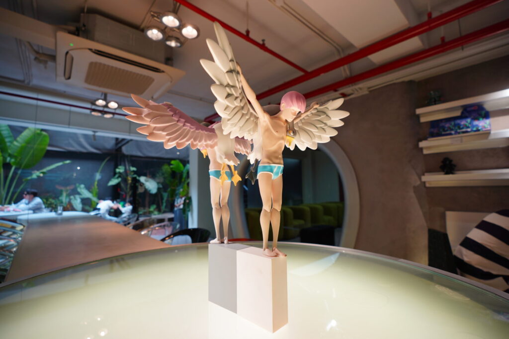 極めつけは店内中央に置かれたフィギュア。翼を持ちながらも、下着姿でブロックの上に立つ彼らの姿から、どんなメッセージを受け取れば良いのか…!?作品名は「飛翔」とかかな(※適当)。