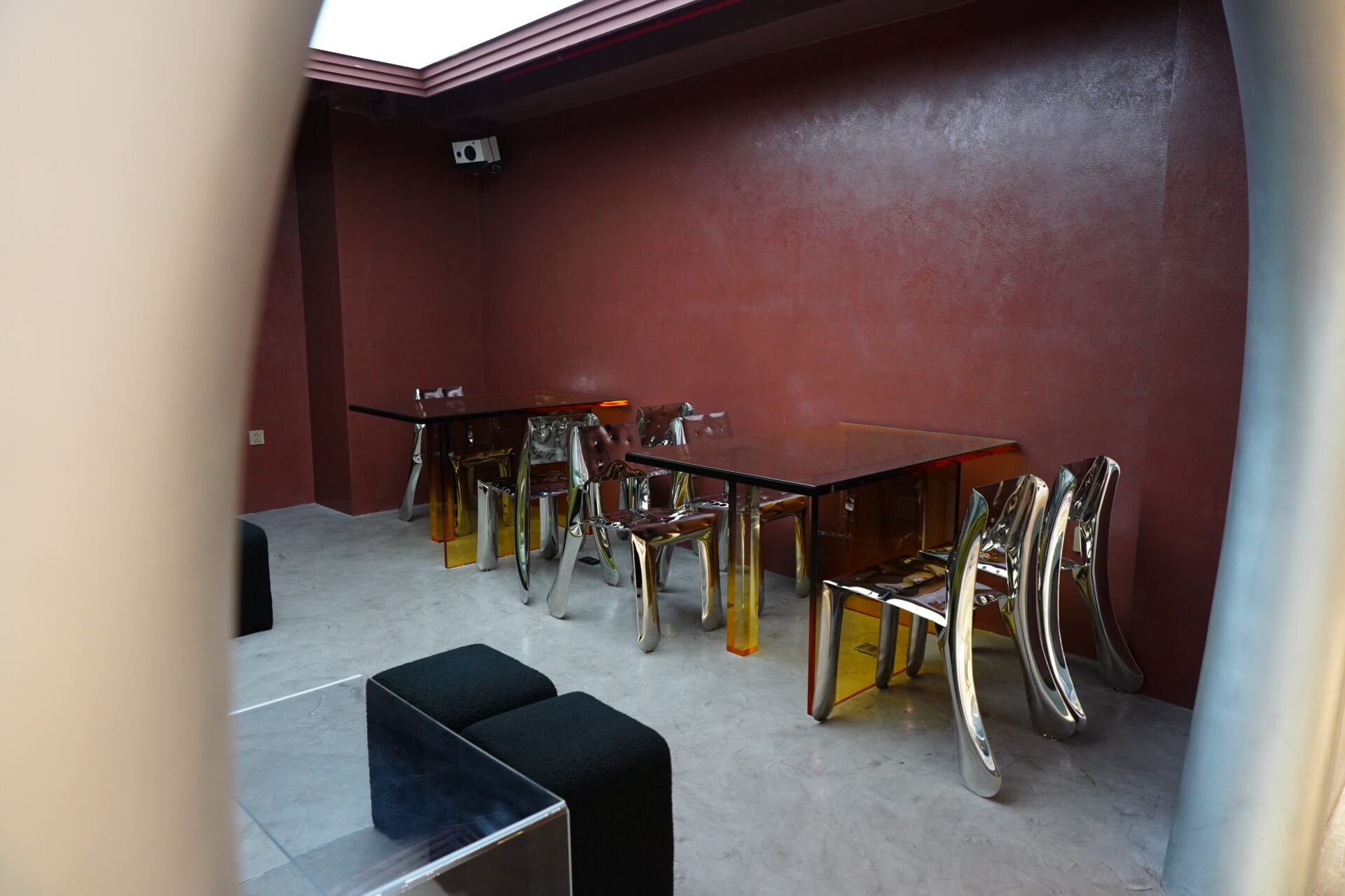 鏡面仕上げのメタリックなチェアや、鮮やかなアンバーの透明テーブル。天然石を土台にしたモダンな白いテーブルと、透明なポリカーボネート製のチェア。どこを切り取っても映える空間です。