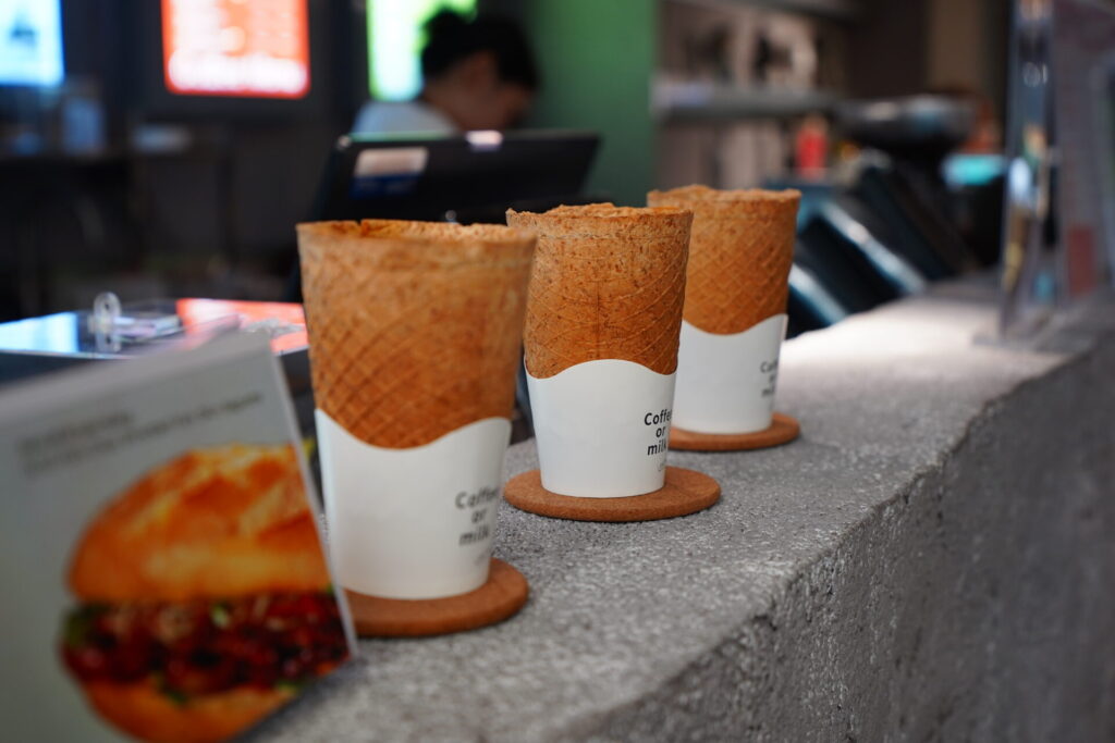 内側にチョコをコーティングしたワッフルコーンをカップ代わりにして飲む提供スタイルも。これ、他の店のインスタで見たやつだ!流行っているのだろうか…?