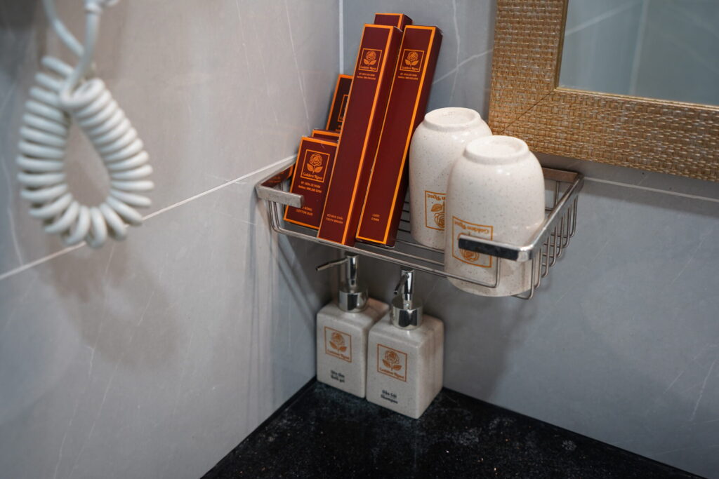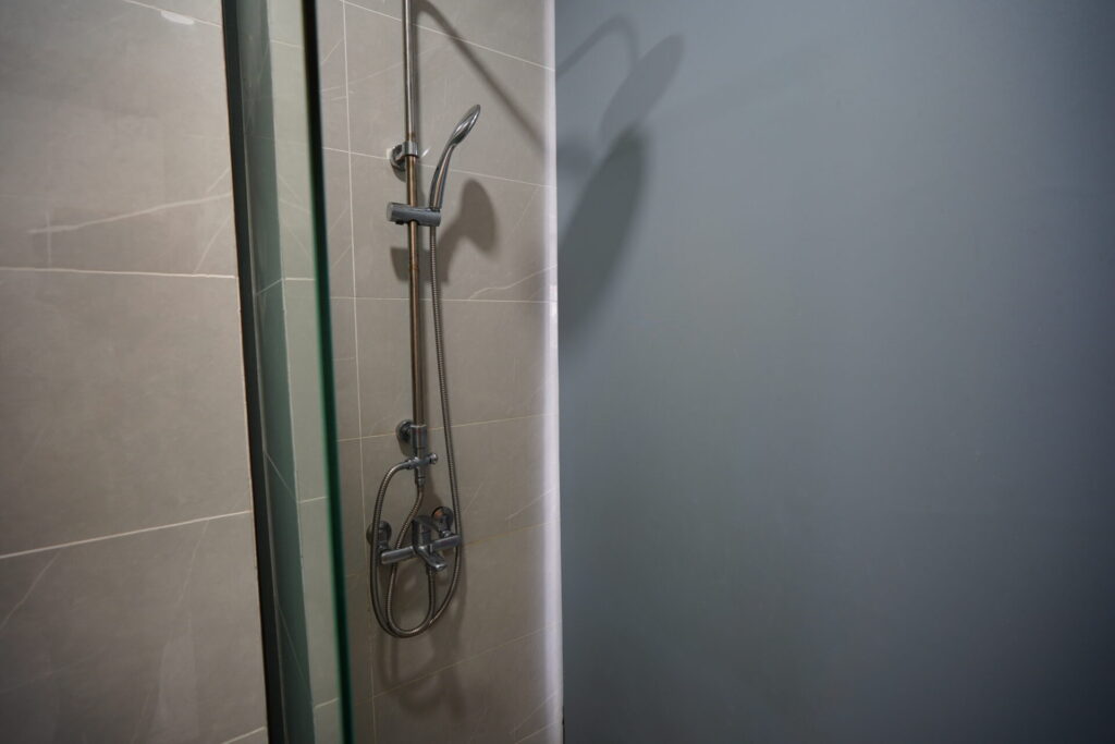 水回り。洗面所・トイレとシャワーブースの間に仕切りがない、ベトナムのローカルアパートや安価なホテルではよく見られるタイプのもの。お湯は時間帯によってはなかなか出ないものの、待っていればそのうち出るし、水圧も十分。