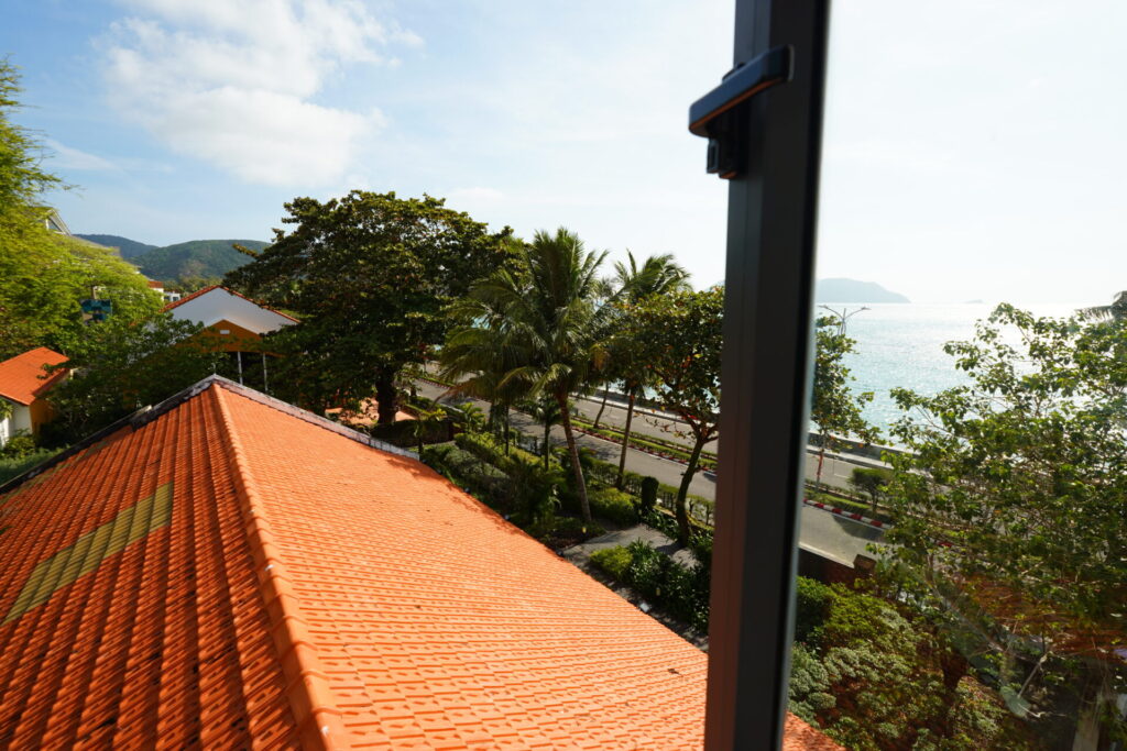 大きな窓からは島の街並みが見渡せ、オレンジ色の屋根の向こうにエメラルドグリーンの海を望むことができます。「The Secret」よりも眺めが良いぞ!?