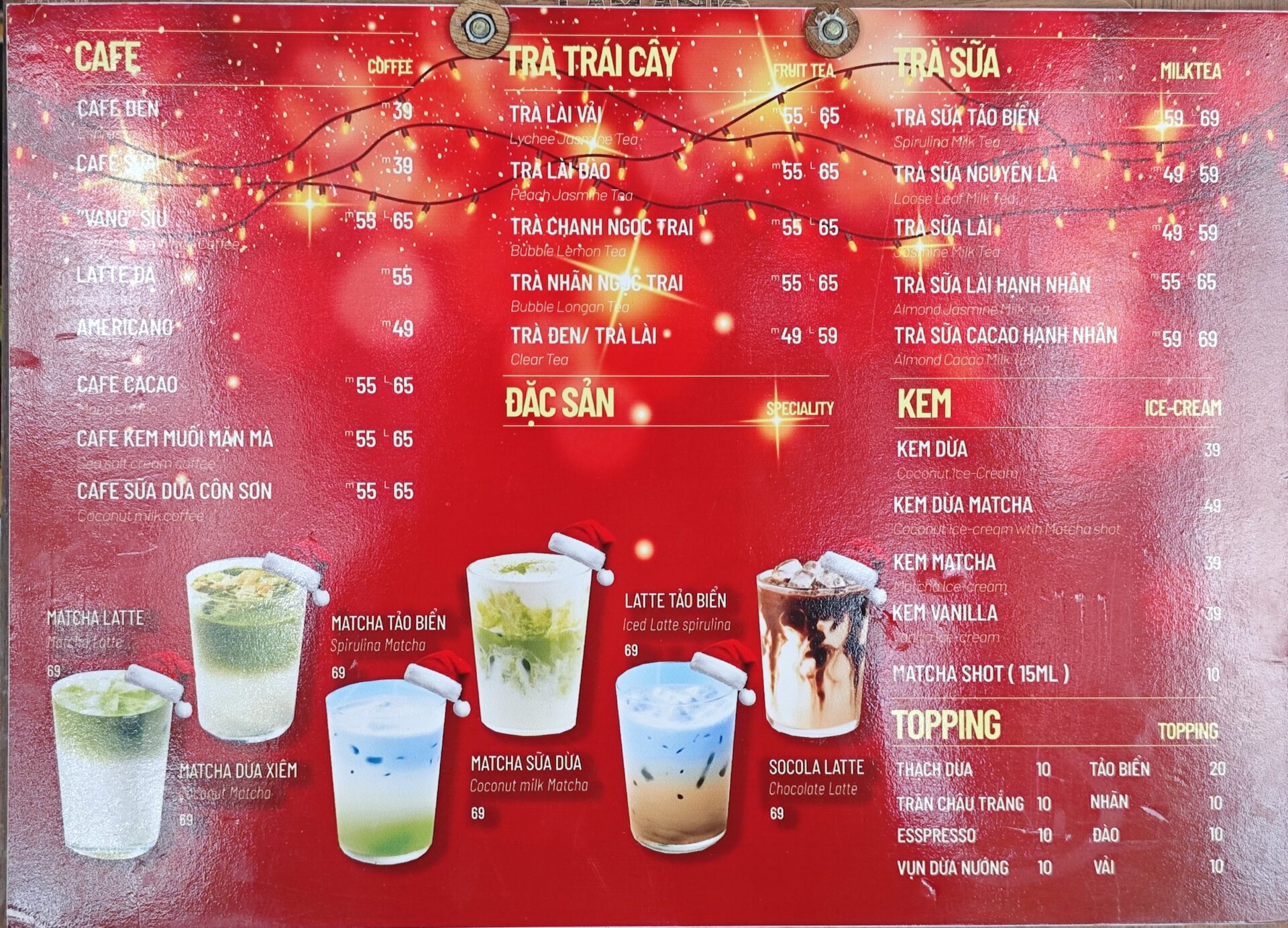 メニューも結構個性的で面白い。スピルリナを使った鮮やかなブルーの「Latte Tảo Biển」など、視覚的にも楽しいドリンクが揃っています。