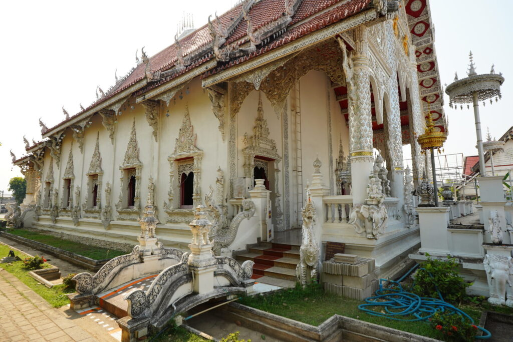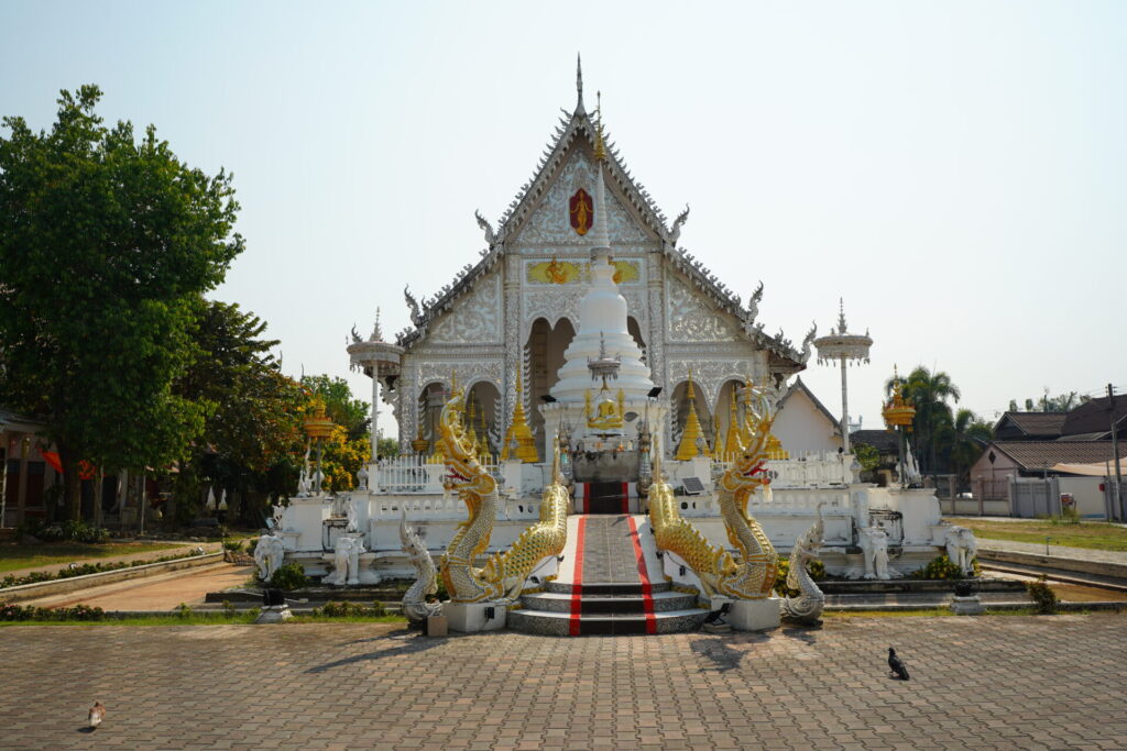 青空に映える真っ白な彫刻と、細かな鏡の装飾が日光を反射して輝きます。タイ最北の地・チェンライに純白の寺院(ワット・ローンクン)があるのは有名ですが、こちらはどうやら、チェンライ出身者が故郷を偲んで建立したものだとか。
