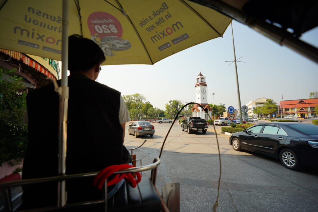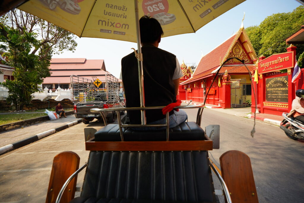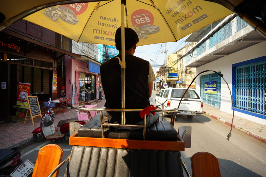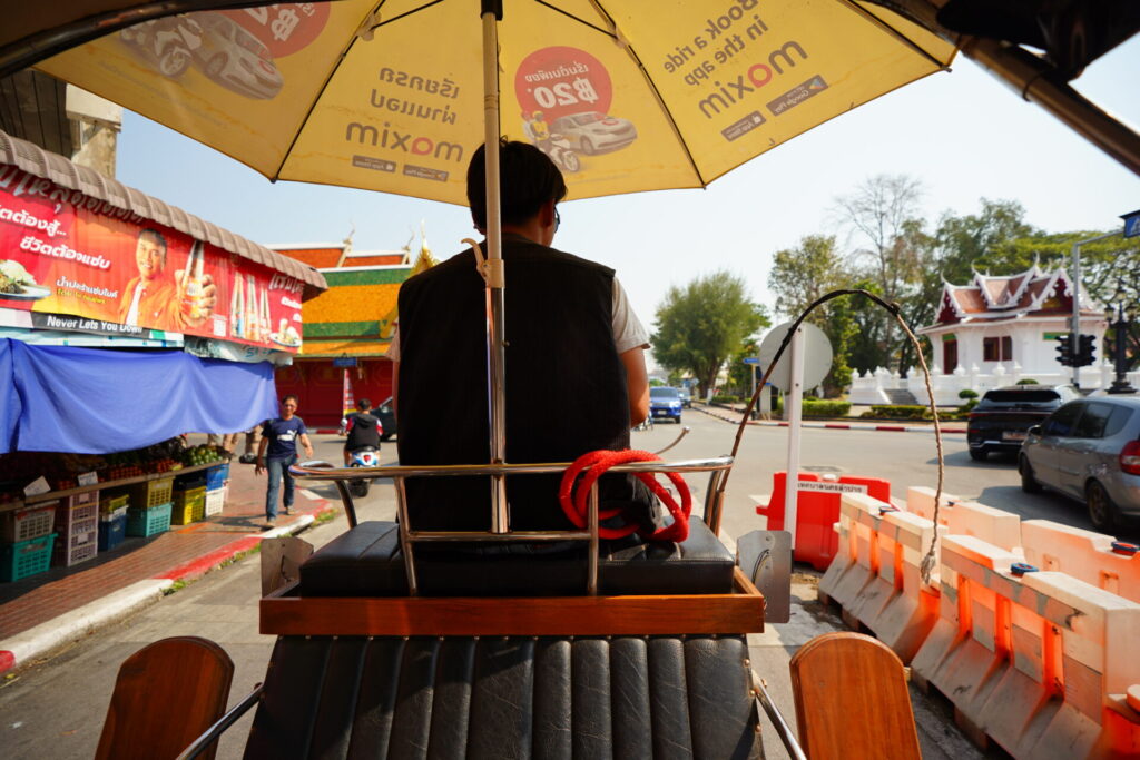 今回は、気軽に街の空気感を味わえそうな、旧市街をぐるっと回る300バーツのコースを選択しました。早速、御者に促されるまま、日除けの傘がついた客席に乗り込みます。なお、料金は後払い。