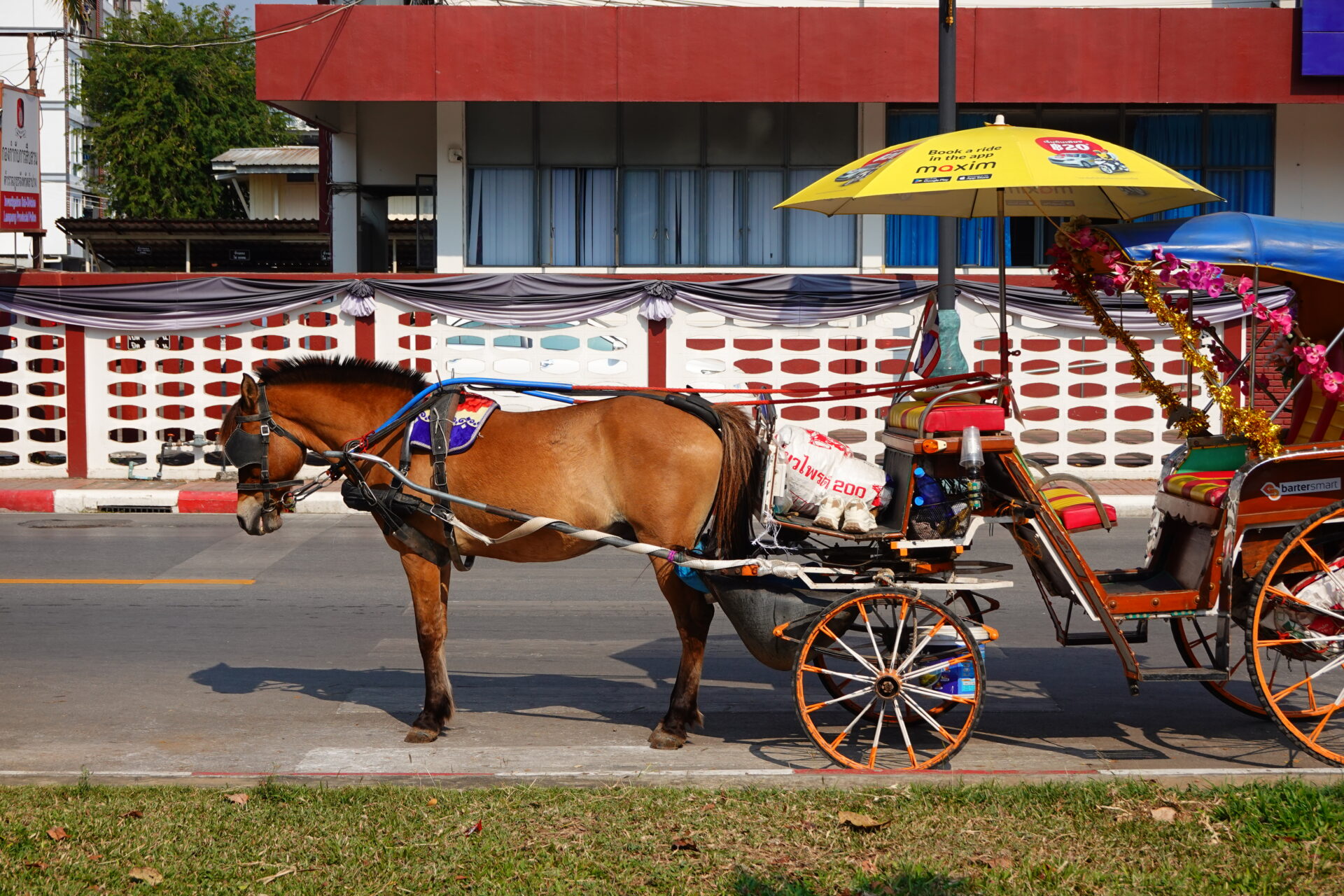今回は、気軽に街の空気感を味わえそうな、旧市街をぐるっと回る300バーツのコースを選択しました。早速、御者に促されるまま、日除けの傘がついた客席に乗り込みます。なお、料金は後払い。