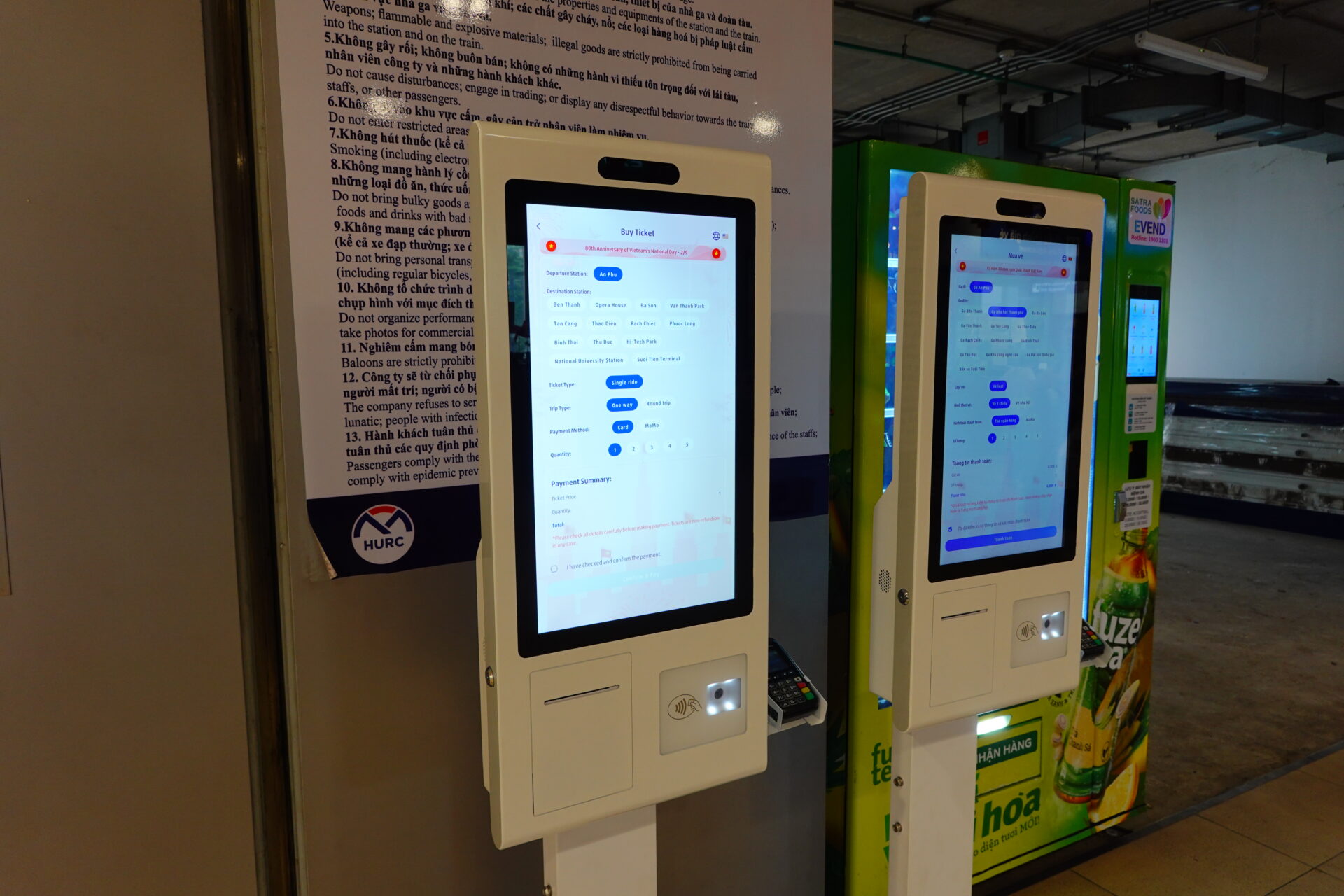 券売機はタッチパネル式。行き先を選択し、お金を払えばICカードタイプのチケットが排出されます。また、画面左下より言語を切り替え可能(ベトナム語・英語)。