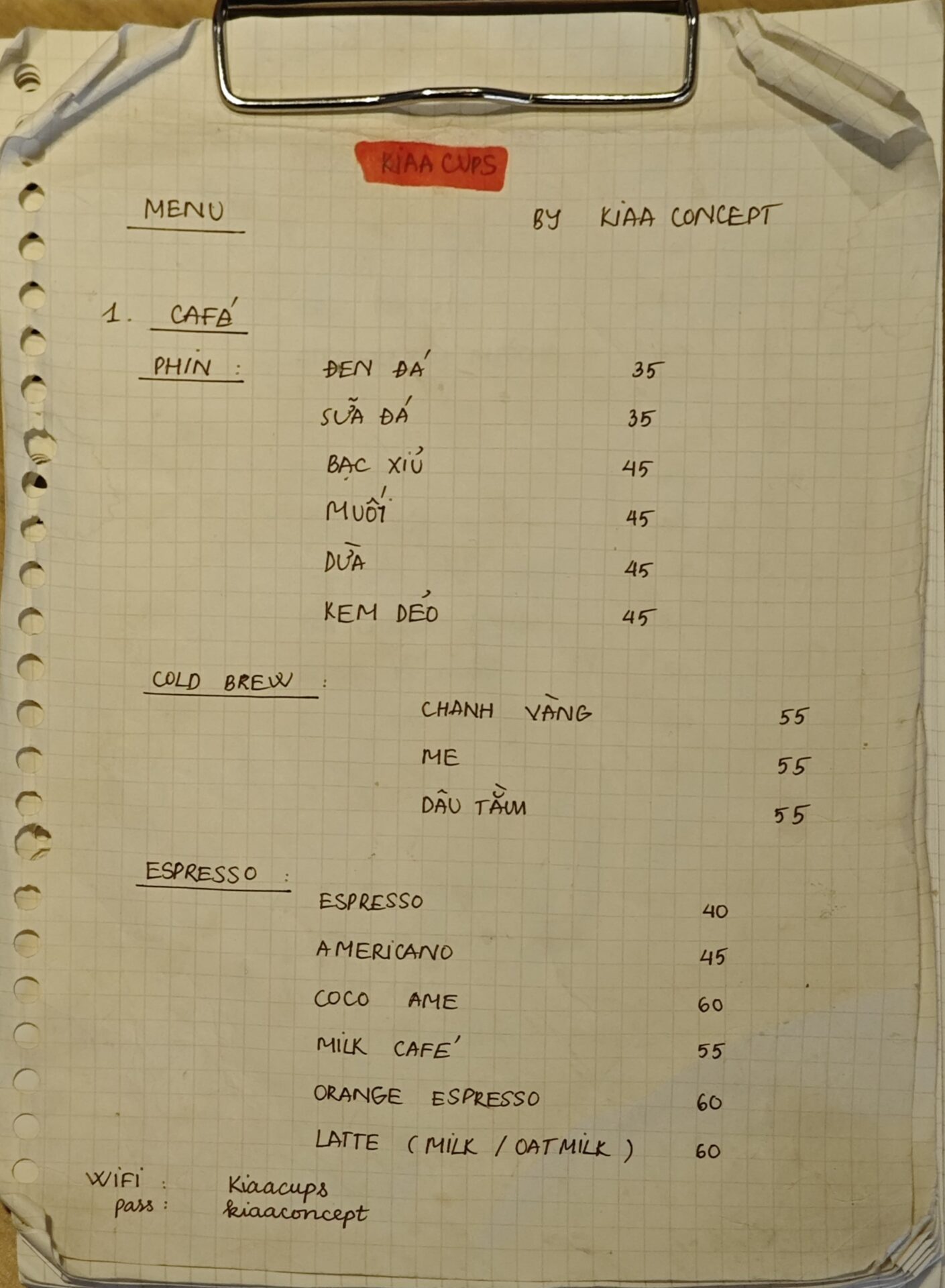 「Kiaacups Café」のメニューはこちら。まさかのルーズリーフに手書きであり、このあえての手書きが人間味を感じさせ、空間の温度を少し上げているように思います。1℃くらい(いやに具体的)。