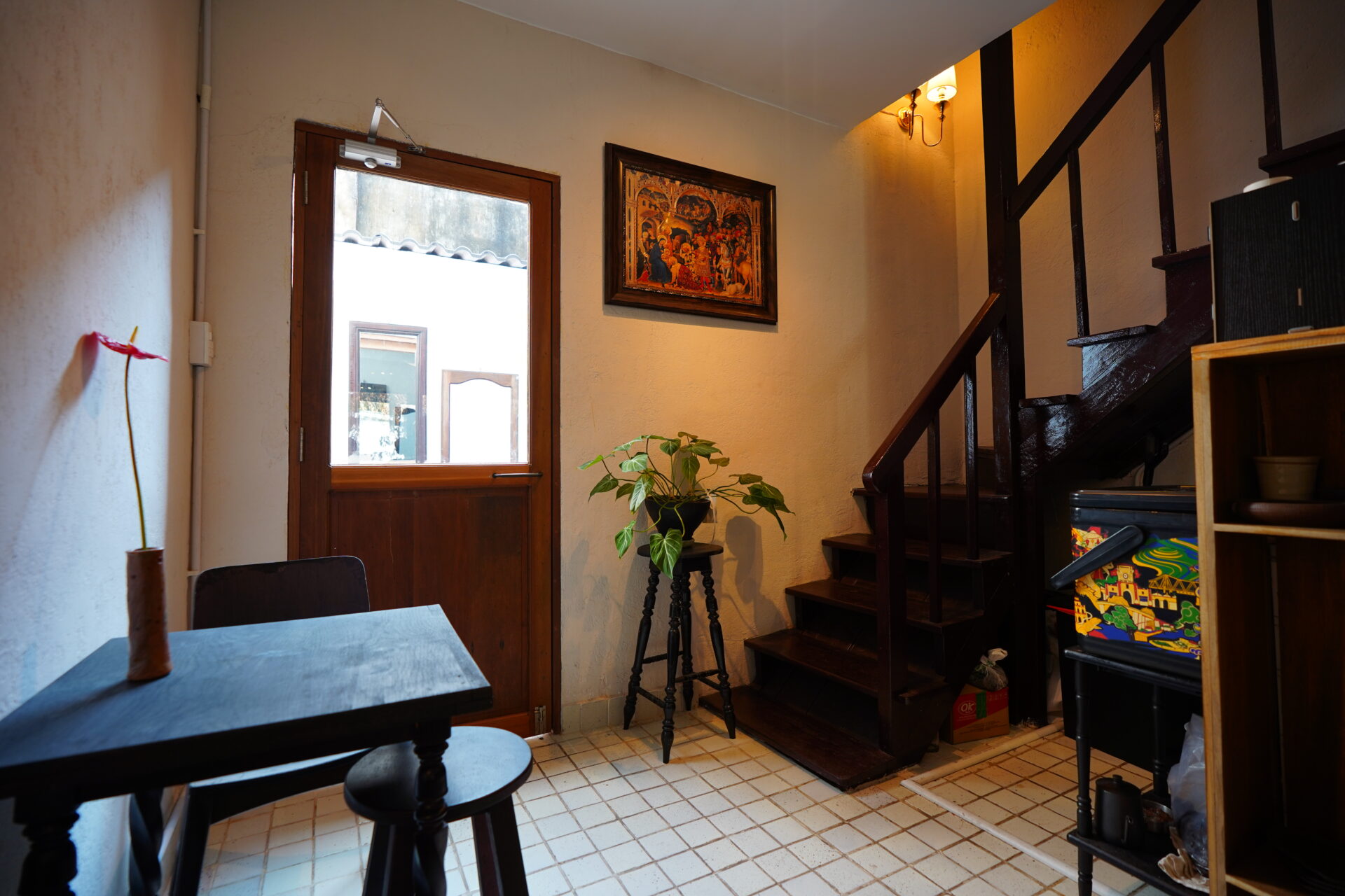 店内の様子がこちら。床は入り口付近のテラコッタ調タイルから、白いスクエアタイルへと切り替わります。質感のある塗り壁が特徴的で、使い込まれたようなウッド家具が空間に落ち着きを与えます。