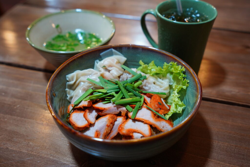 チャーシューとワンタンの和え麺(Mì Hoành Thánh Xá Xíu Trộn)が80,000ドン。空港近くということもあってか、意外と外国人客も多かった。