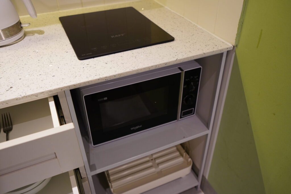 電子レンジ、IHクッキングヒーター、冷蔵庫、電気ケトルを完備。引き出しには、お皿やボウル、スプーン、フォーク、さらにはお箸まで揃っています。