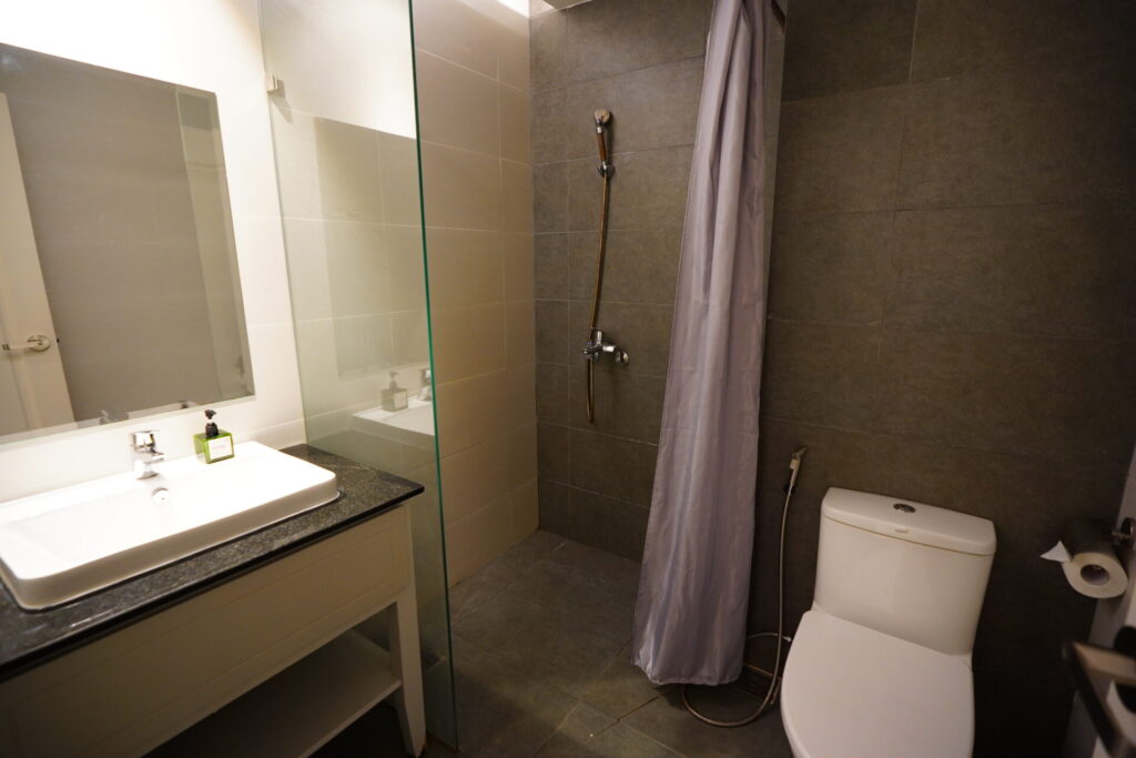 グレーのタイルで統一されたシャワールーム。シャワーカーテンしか仕切りが無いものの、思ったほど水は流出せず。強いて言うならトイレットペーパーが変な位置にあり、巻き取りにくい…。
