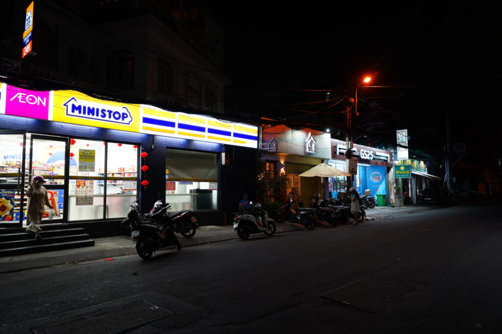 ホテル周辺のご紹介。まず、コンビニが「Ministop」と「GS25」の2軒。その間に挟まれているのは、ユニークなベッドカフェ「Chidori」です。