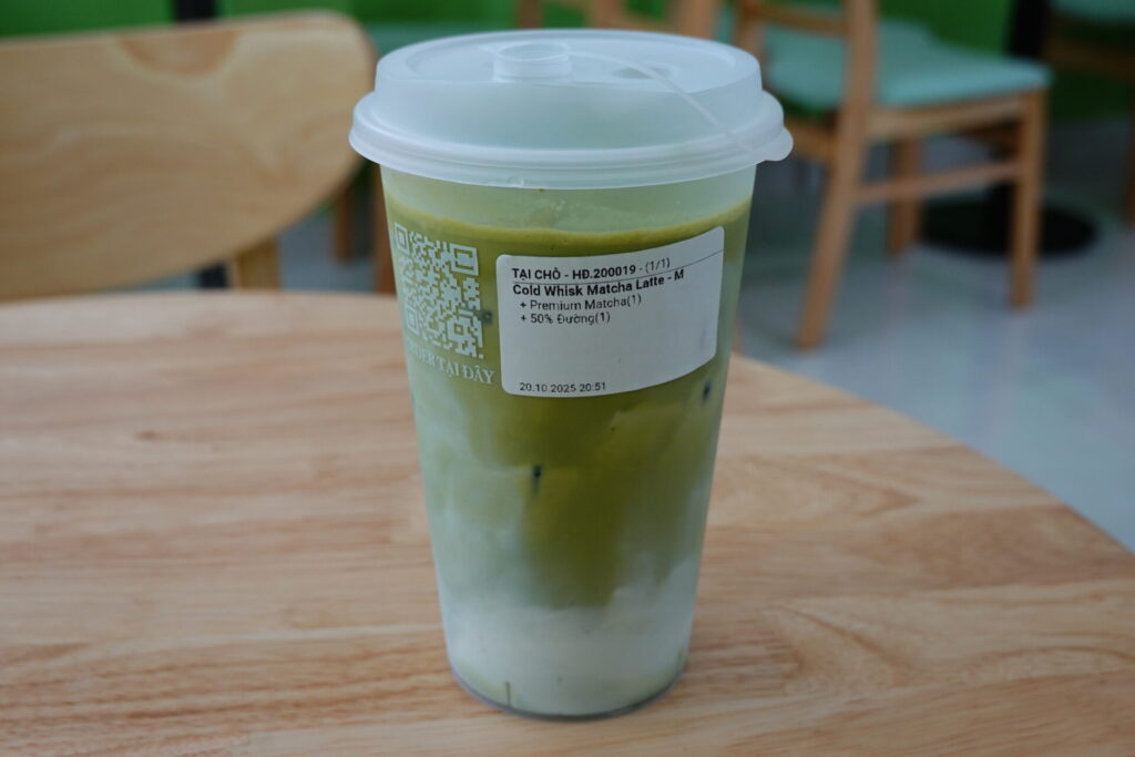 続いて「Cold Whisk Matcha Latte」。こちらはMサイズ50,000ドン。メニューによれば「抹茶を直接ミルクとウィスクする(点てる)」製法です。