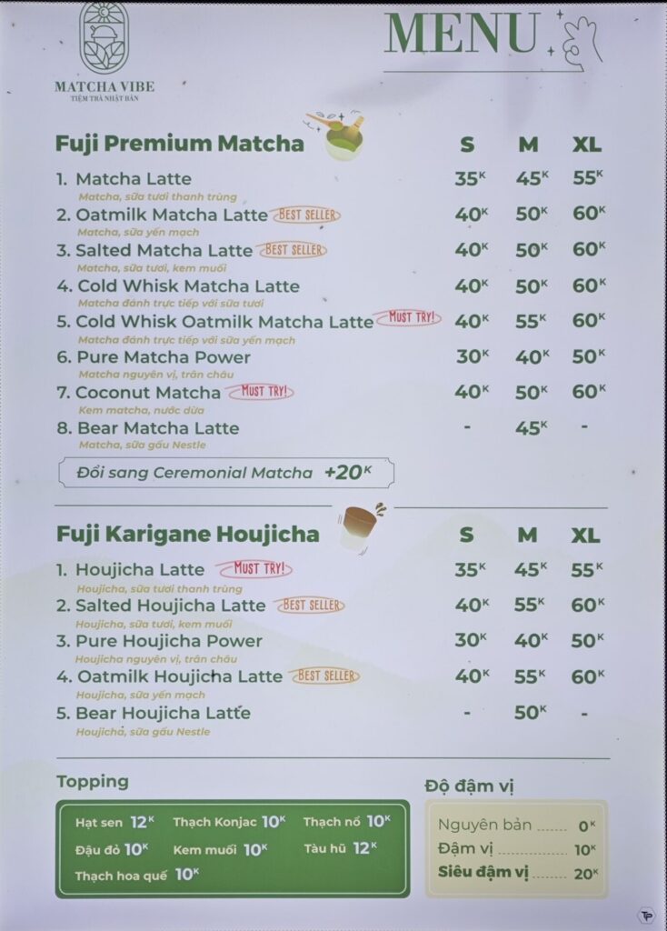 Matcha Vibeは、その製品品質を「Fuji基準」「プレミアム/上級(Thượng hạng)」 と位置づけ、メニューには「宇治、京都、日本産」と明記しているものもあります。これを信じるのであれば、価格は高騰するはずですが、同ブランドは抹茶ラテのSサイズを35,000ドンという中間価格帯に設定しています。