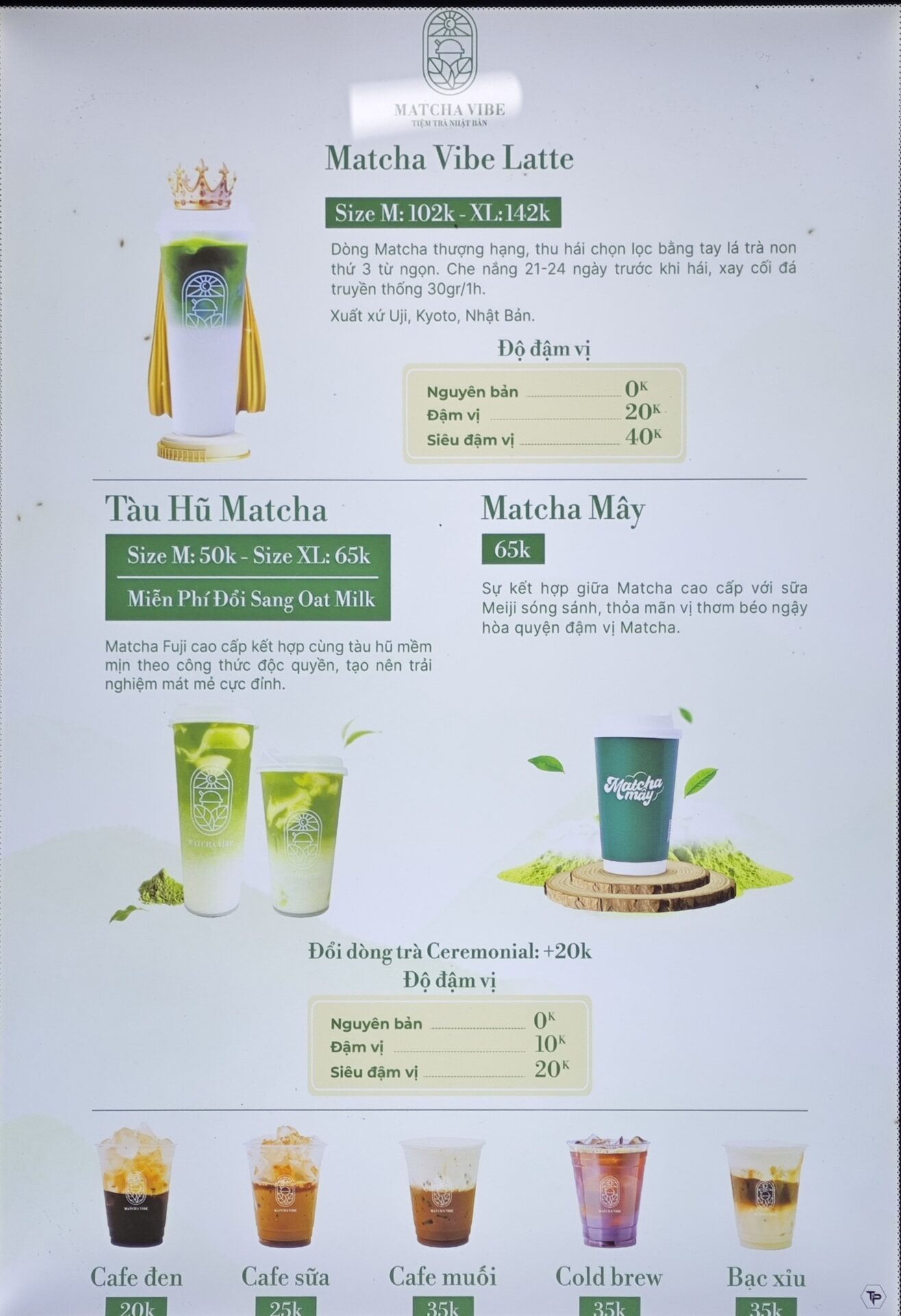 Matcha Vibeは、その製品品質を「Fuji基準」「プレミアム/上級(Thượng hạng)」 と位置づけ、メニューには「宇治、京都、日本産」と明記しているものもあります。これを信じるのであれば、価格は高騰するはずですが、同ブランドは抹茶ラテのSサイズを35,000ドンという中間価格帯に設定しています。