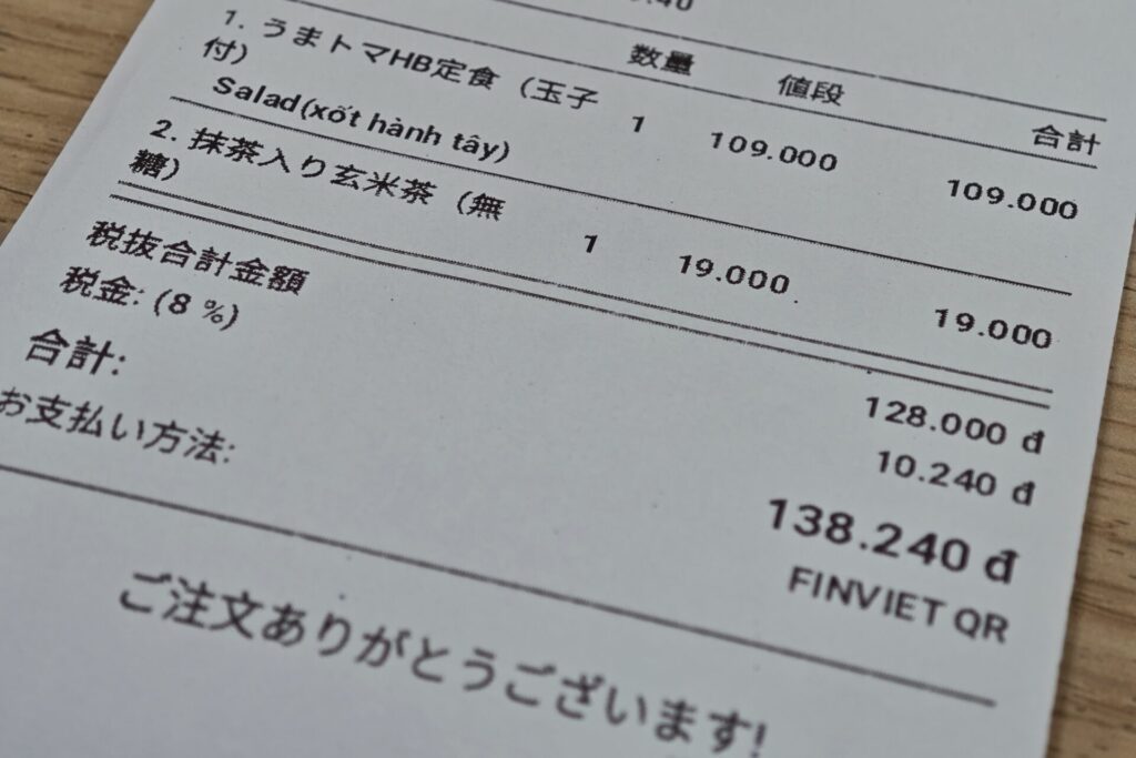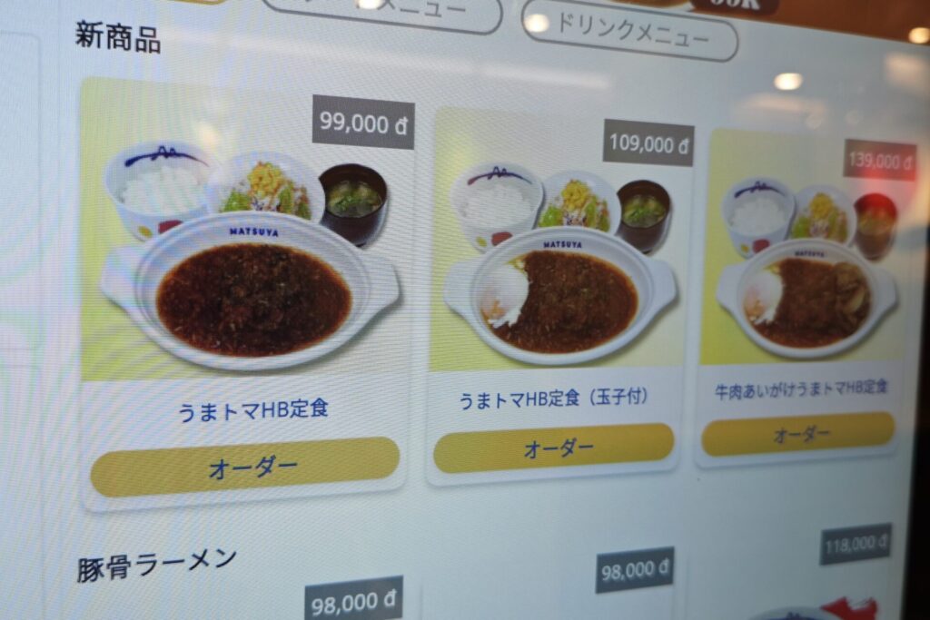タッチパネルのメニューを見ると…あ り ま し た。ベーシックな「うまトマHB定食(99,000VND)」、半熟玉子付きの「うまトマHB定食(玉子付)(109,000VND)」、そして牛肉あいがけに「牛肉あいがけうまトマHB定食(139,000VND)」の3種類がラインナップ。