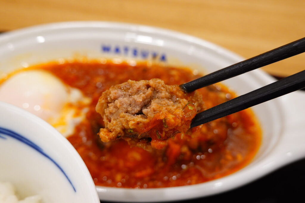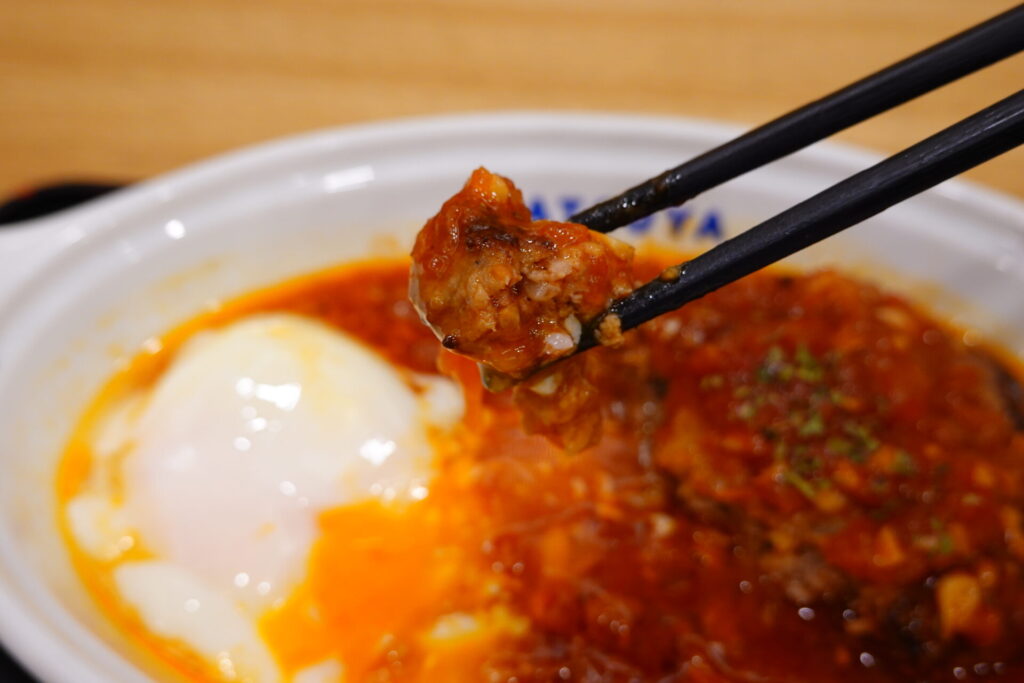ゴロゴロと具材感の残るソースは、トマトのフレッシュな酸味と凝縮された旨味がベース。そこに、力強いにんにくの風味がガツンとやってきます。野菜をじっくり煮込んだような奥深い甘みにトマト由来の旨味も合わさり、米が進みすぎる…。