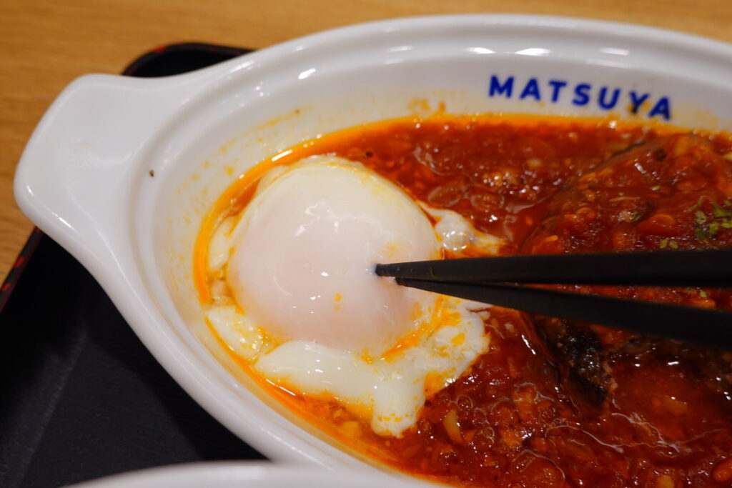半熟卵に箸を入れて…。