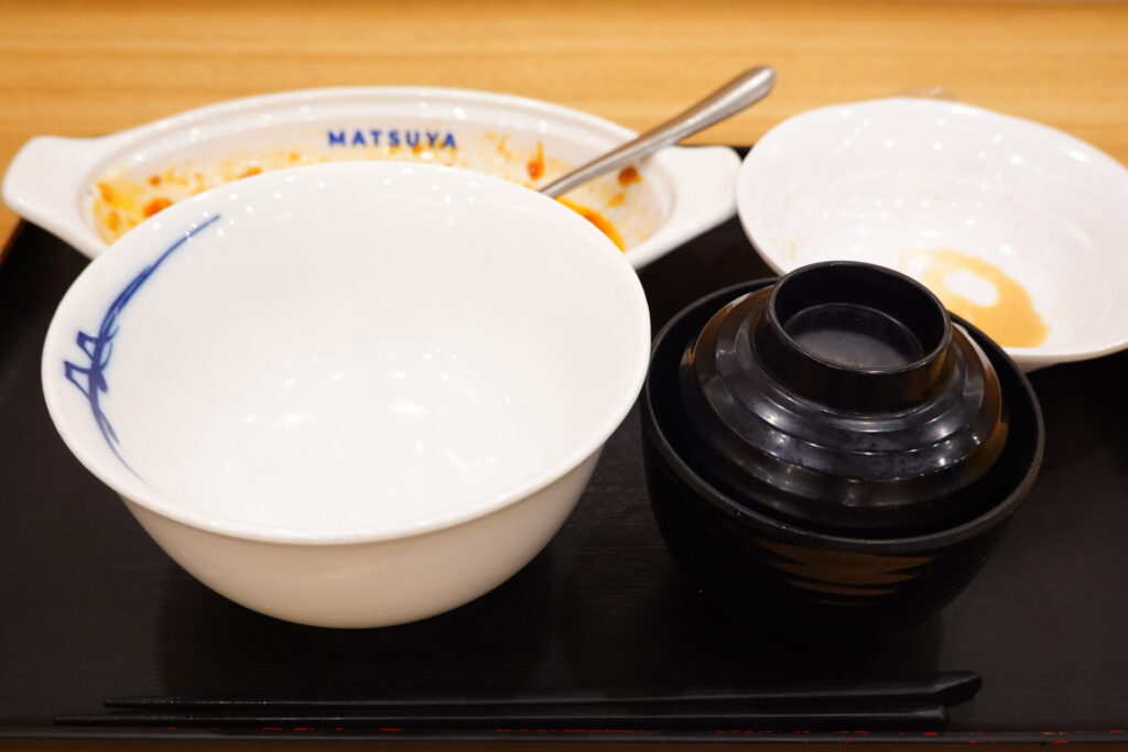 ソースや卵は結構残ります。ソースだけでもご飯が進む進む。即席のうまトマ丼にして最後の一滴まで味わいたいところですが、かなりのカロリー爆弾なので、ソースを全て平らげるのはやめておきました(定食で1,000カロリー近くあります)。
