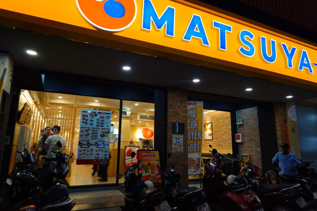 2024年にベトナム進出した松屋も、現在はホーチミン市内に4店舗を展開。また、2号店であるグエンザーチー店はいつの間にか24時間営業となっておりました。