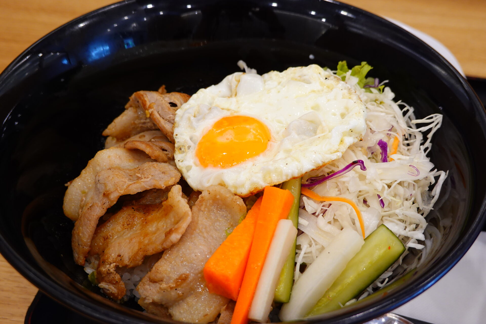 来ました。ご飯、みそ汁、そしてサラダ(オニオンドレッシング)付きです。サラダのドレッシングは一時期ごまベースのものに変わったのですが、最近になってオニオンドレッシングに戻りました。元のドレッシングの方が酸味があって好きだったから、嬉しい。