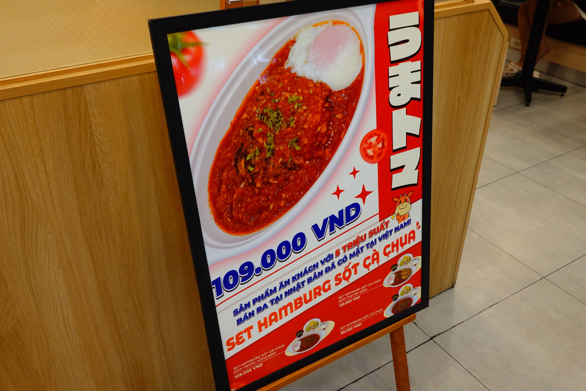 タッチパネルのメニューを見ると…あ り ま し た。ベーシックな「うまトマHB定食(99,000VND)」、半熟玉子付きの「うまトマHB定食(玉子付)(109,000VND)」、そして牛肉あいがけに「牛肉あいがけうまトマHB定食(139,000VND)」の3種類がラインナップ。