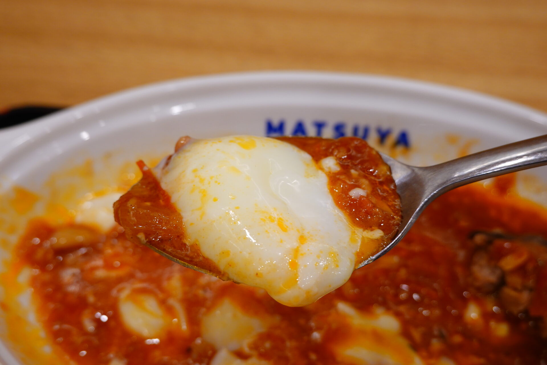 半熟卵に箸を入れて…。