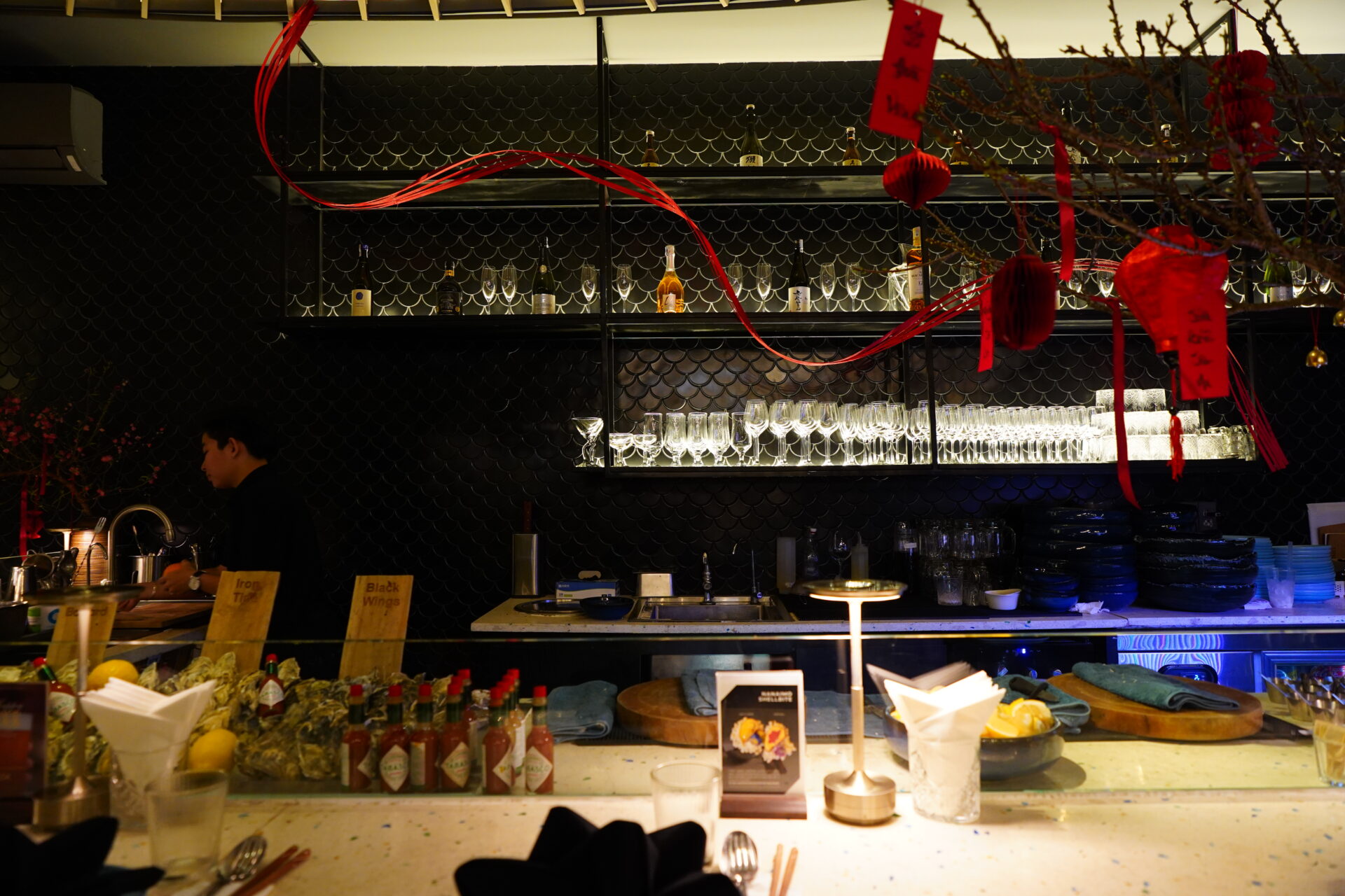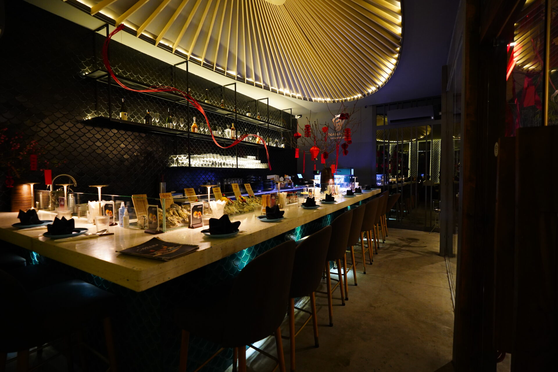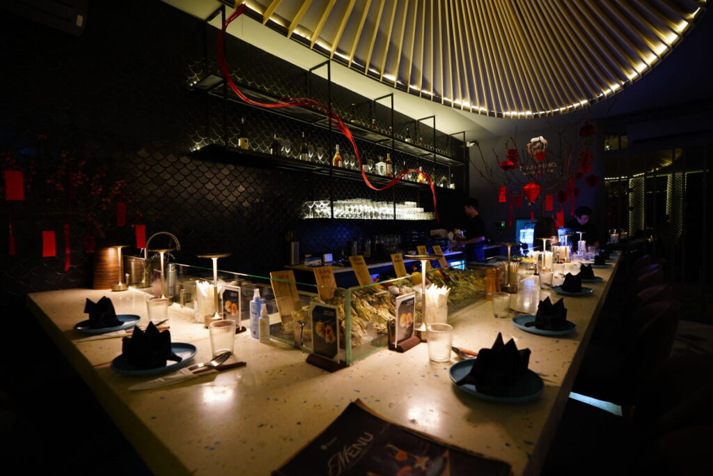 カウンター下の波打つタイルを照らす鮮やかなブルーのLEDは、まさに深海を想起させ、各テーブルの小型ランプが料理をドラマティックに引き立てます。