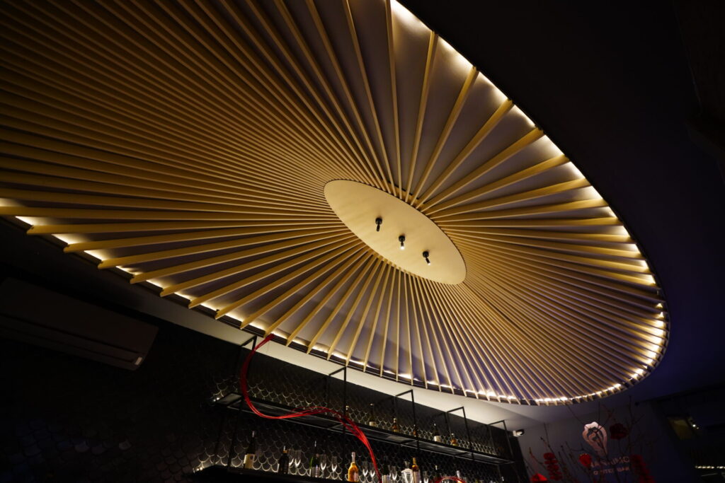 天井から放射状に広がる巨大な木製ルーバーのデザインが目を引く。