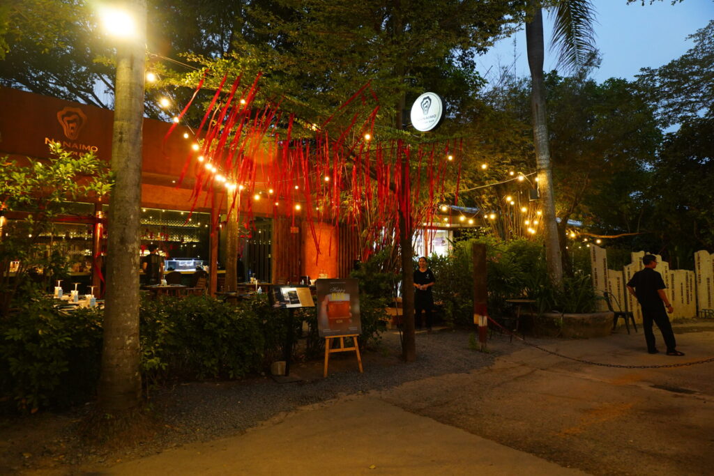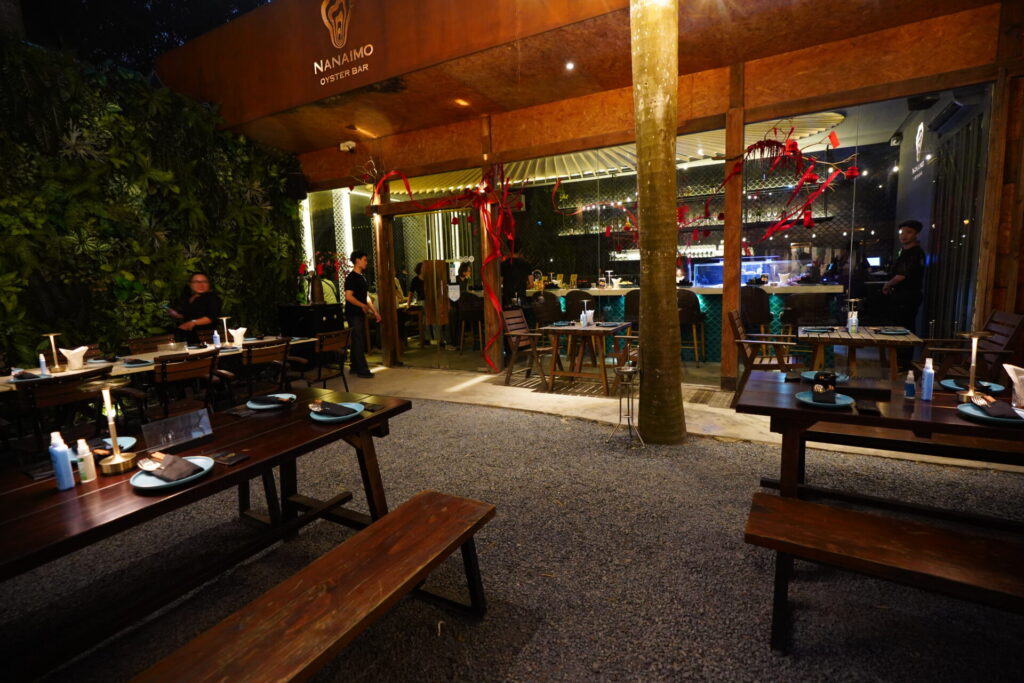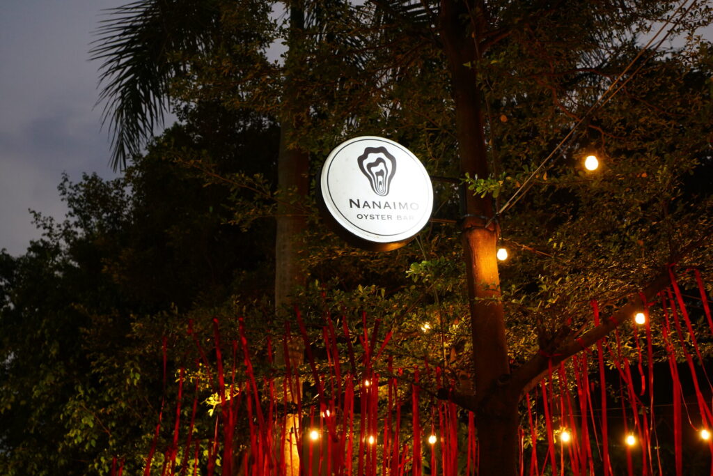 そしてこちらが「Nanaimo Oyster Bar」。張り巡らされたストリングライトが温かく灯り、風に揺れる赤いリボンがなんとも幻想的な夜を演出している。