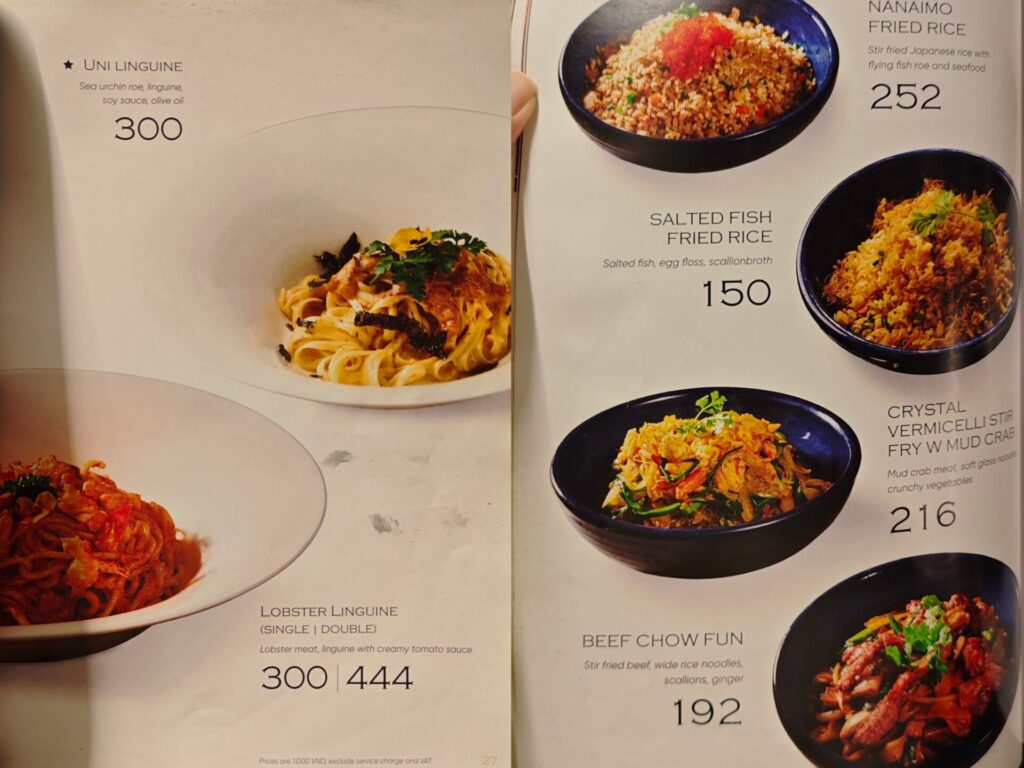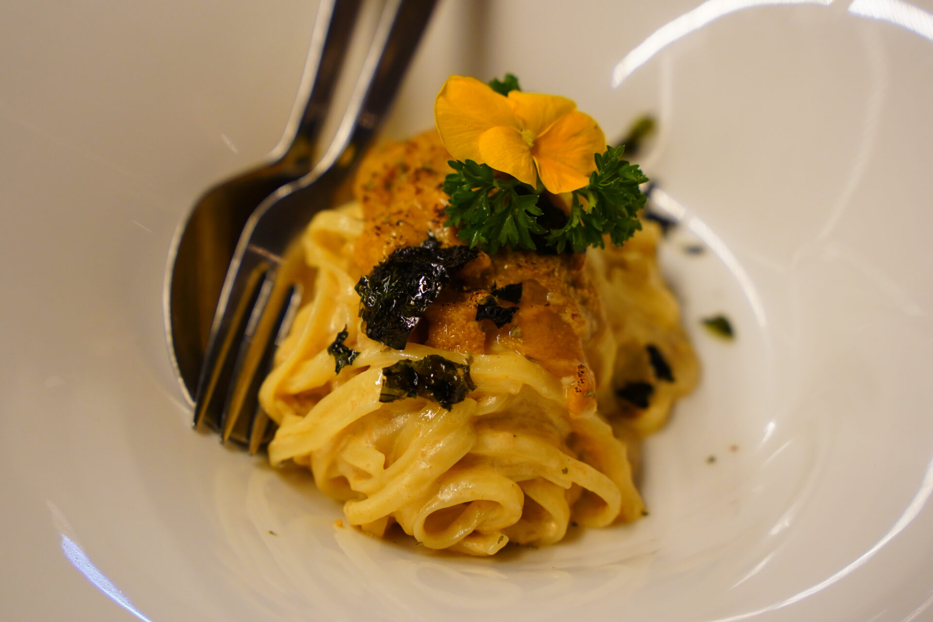 ウニクリームパスタ「Uni Linguine」300,000ドン。パスタの上に鮮やかな生ウニと海苔、エディブルフラワーが添えられた一皿は、運ばれてきた瞬間にテーブルが華やぎます。