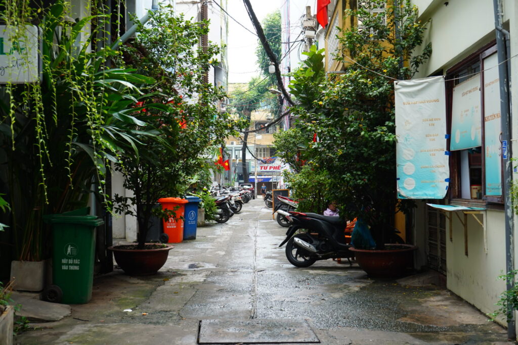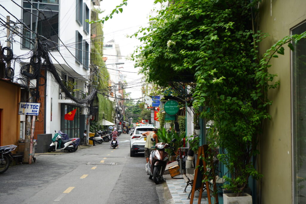 一本隣はハイバーチュン (Hai Bà Trưng) 通りですが、こちらのチュオンクエン通りは大通りの喧騒から離れた、ローカルな食堂やカフェ、商店が並ぶ比較的落ち着いたエリア。