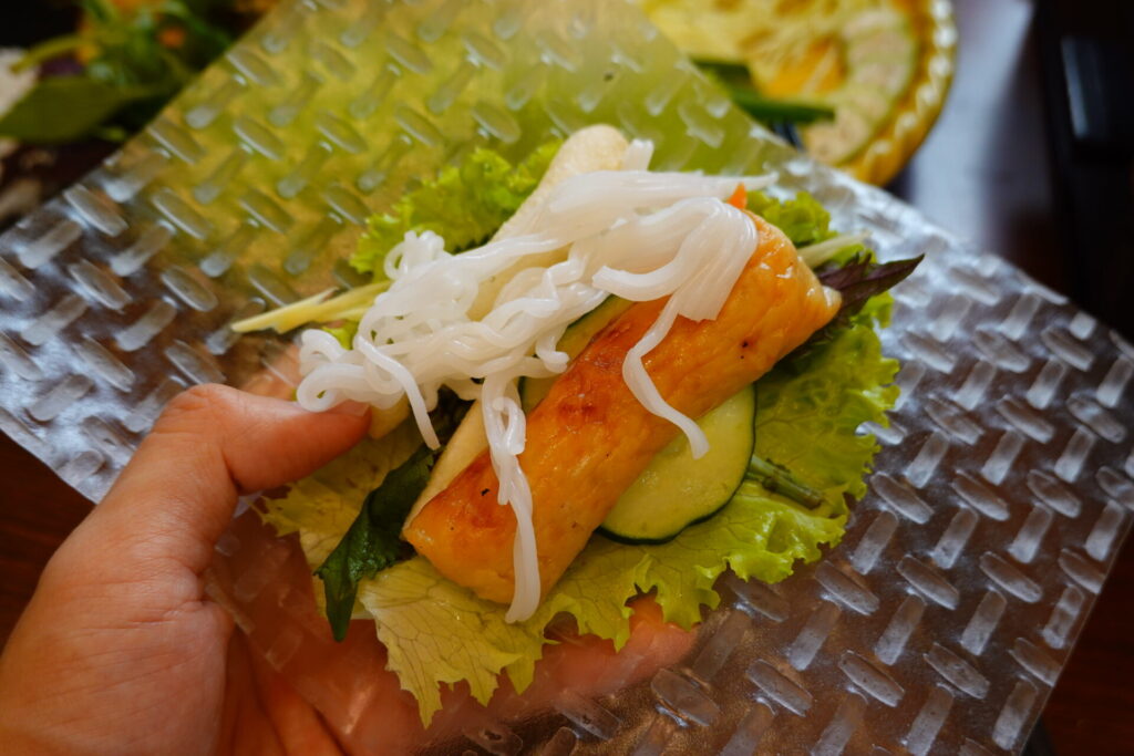 まず感じるのは、Vỏ ram cuốnのザクザクした軽快な歯ごたえ。次に、香ばしく焼かれたNem nướngの弾力と豚肉の旨味。それらを、しっとり柔らかいBún(米麺)と野菜、スライスされた青バナナの渋みが包み込みます。