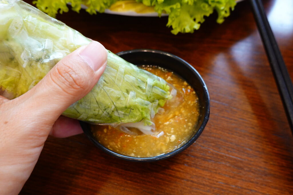 この料理のもう一つの主役が、「50年以上作り続けてきた」という、ピーナッツベースの特製ダレ。オレンジ色でとろみがあり、見るからに濃厚そう。なお、このタレおよびライスペーパーはおかわり自由だそうです。