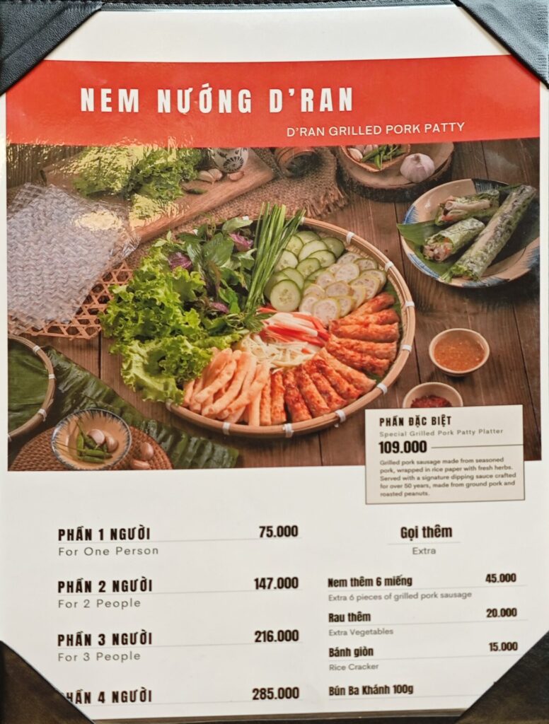 こちらの「Nem nướng D’ran」、ホーチミン市内に5店舗を展開するチェーン店であり、創業はなんと1968年だそう。ベトナム統一前…と考えると、遥か昔のことに思えてしまうな。