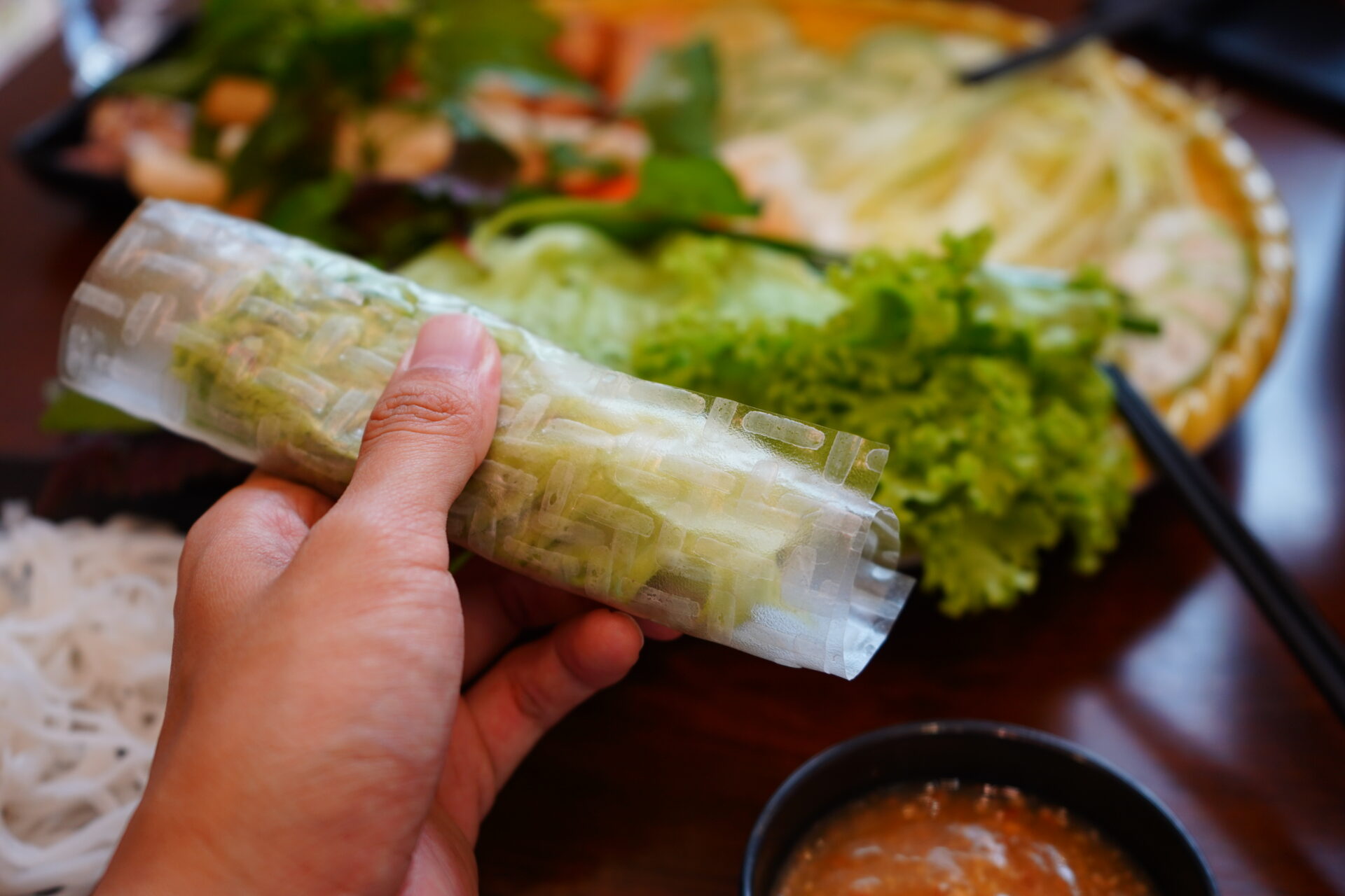 まず感じるのは、Vỏ ram cuốnのザクザクした軽快な歯ごたえ。次に、香ばしく焼かれたNem nướngの弾力と豚肉の旨味。それらを、しっとり柔らかいBún(米麺)と野菜、スライスされた青バナナの渋みが包み込みます。