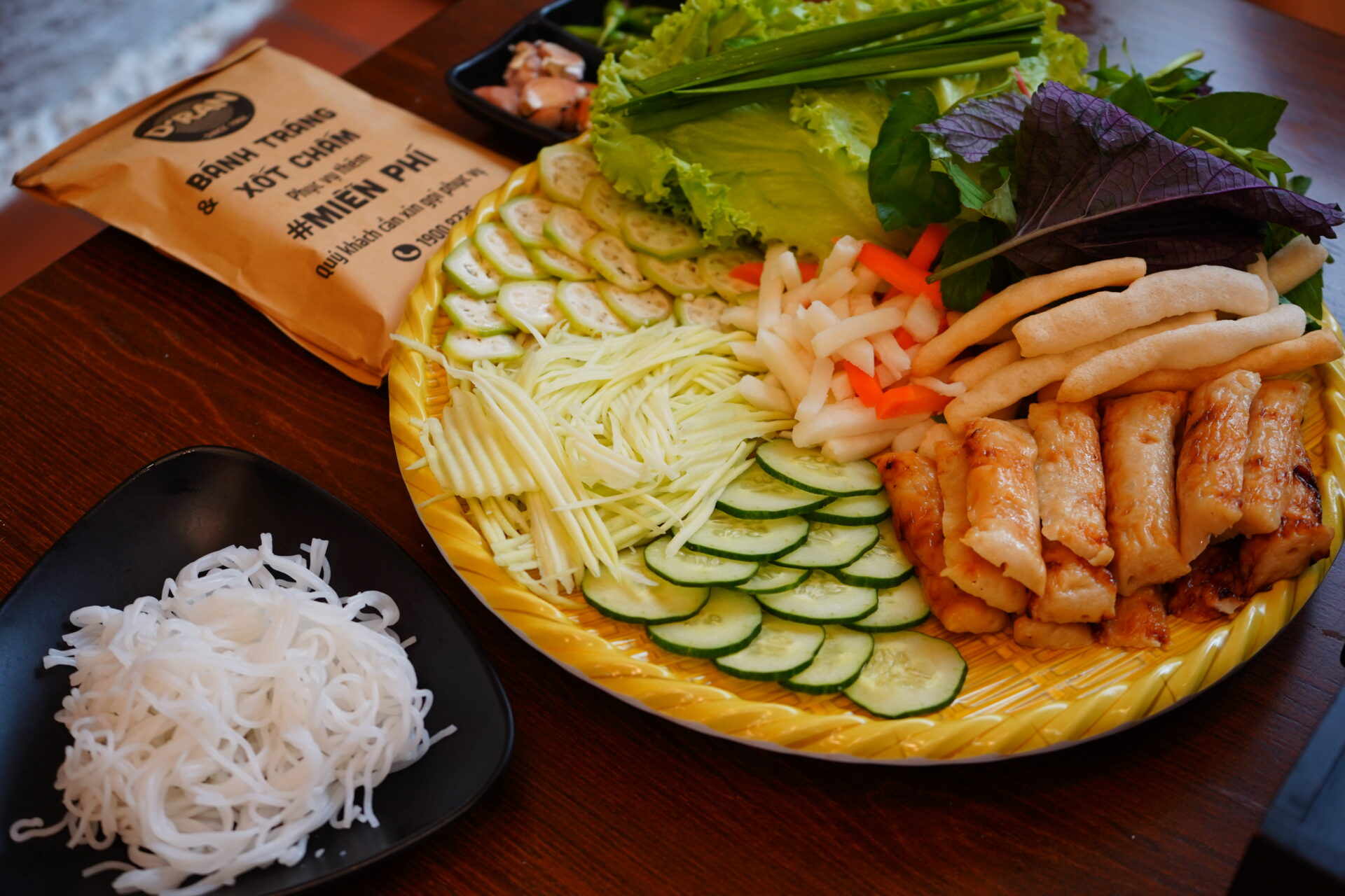 - 野菜&ハーブ:レタス、きゅうり、紫蘇(Tía tô)、スライスした青バナナ、千切りの青マンゴー(青パパイヤ?)、大根と人参のなます(Đồ chua)、ニラなど。とにかく種類が豊富。