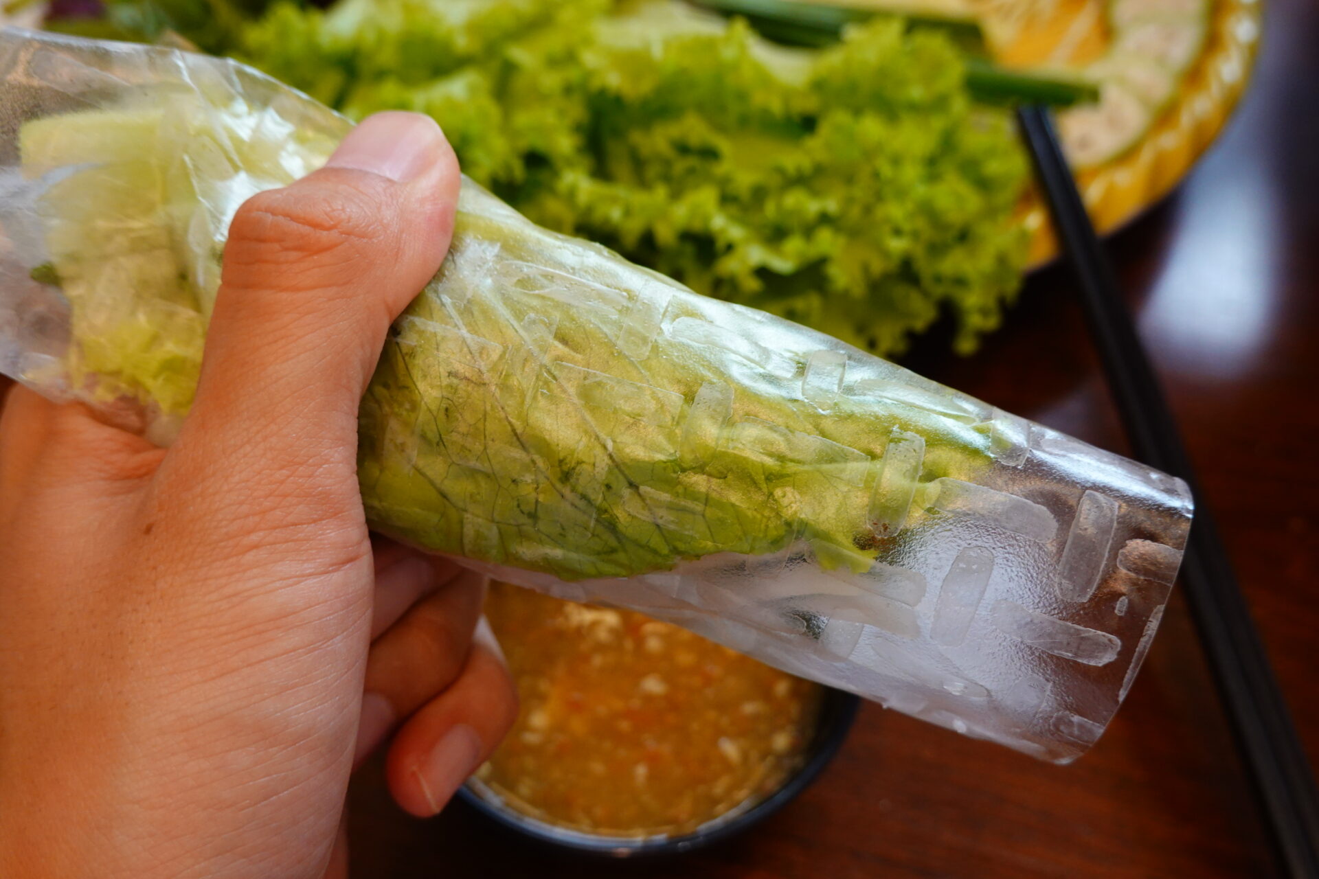 さっそく巻いていきます。このライスペーパーは格子状の模様が入った、水で戻す必要がないタイプ。ライスペーパーを広げ、レタスを敷き、その上にNem nướng、追加のBún、きゅうり、なます、ハーブ、そして食感の決め手である「Vỏ ram cuốn」などを。